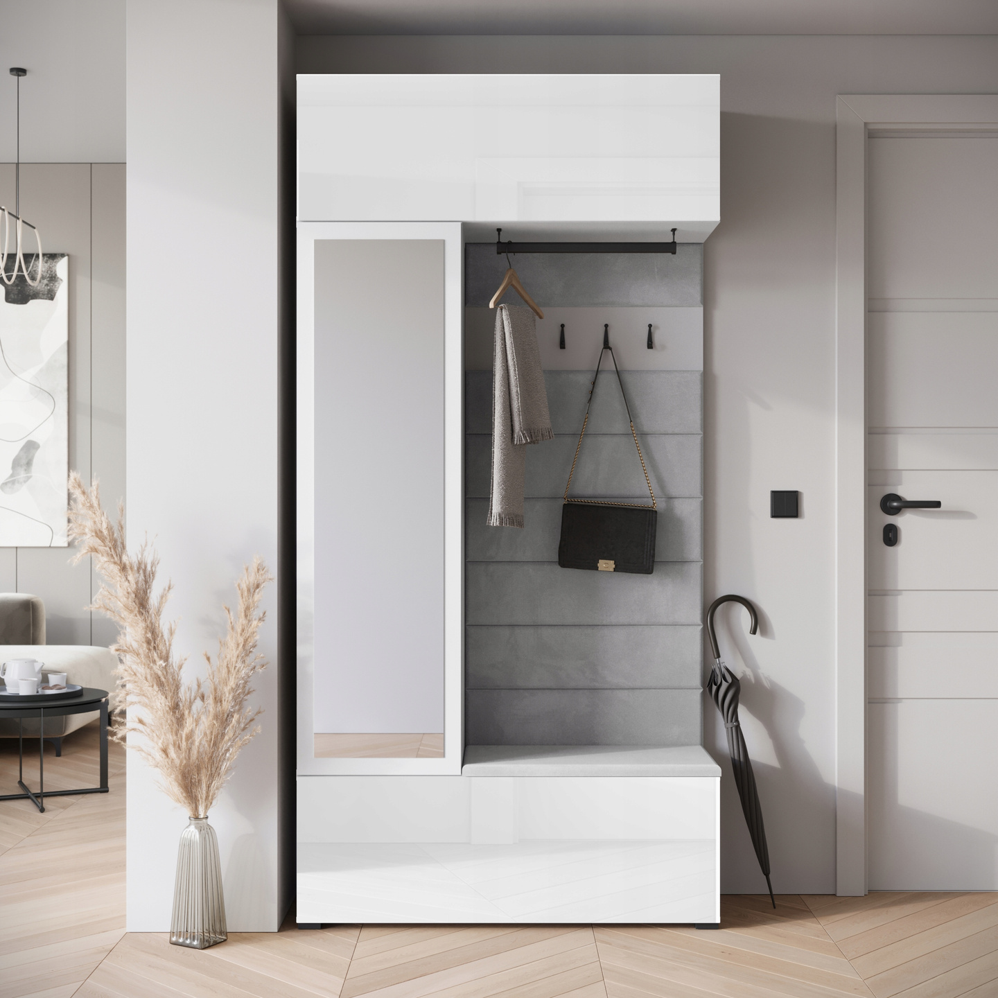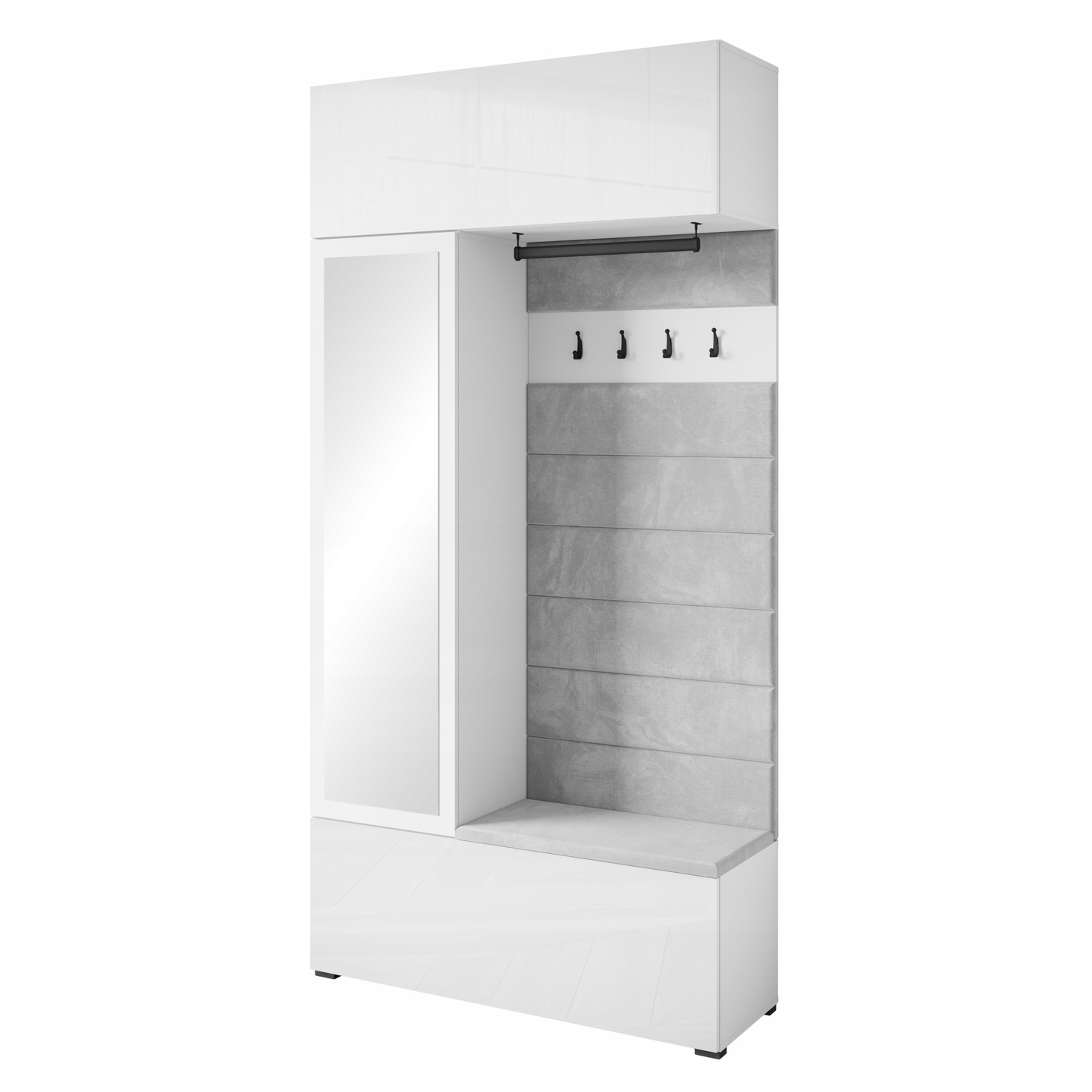 Garderoba TEJO Biały/Biały Połysk + Tapicerka Szara Mono 244