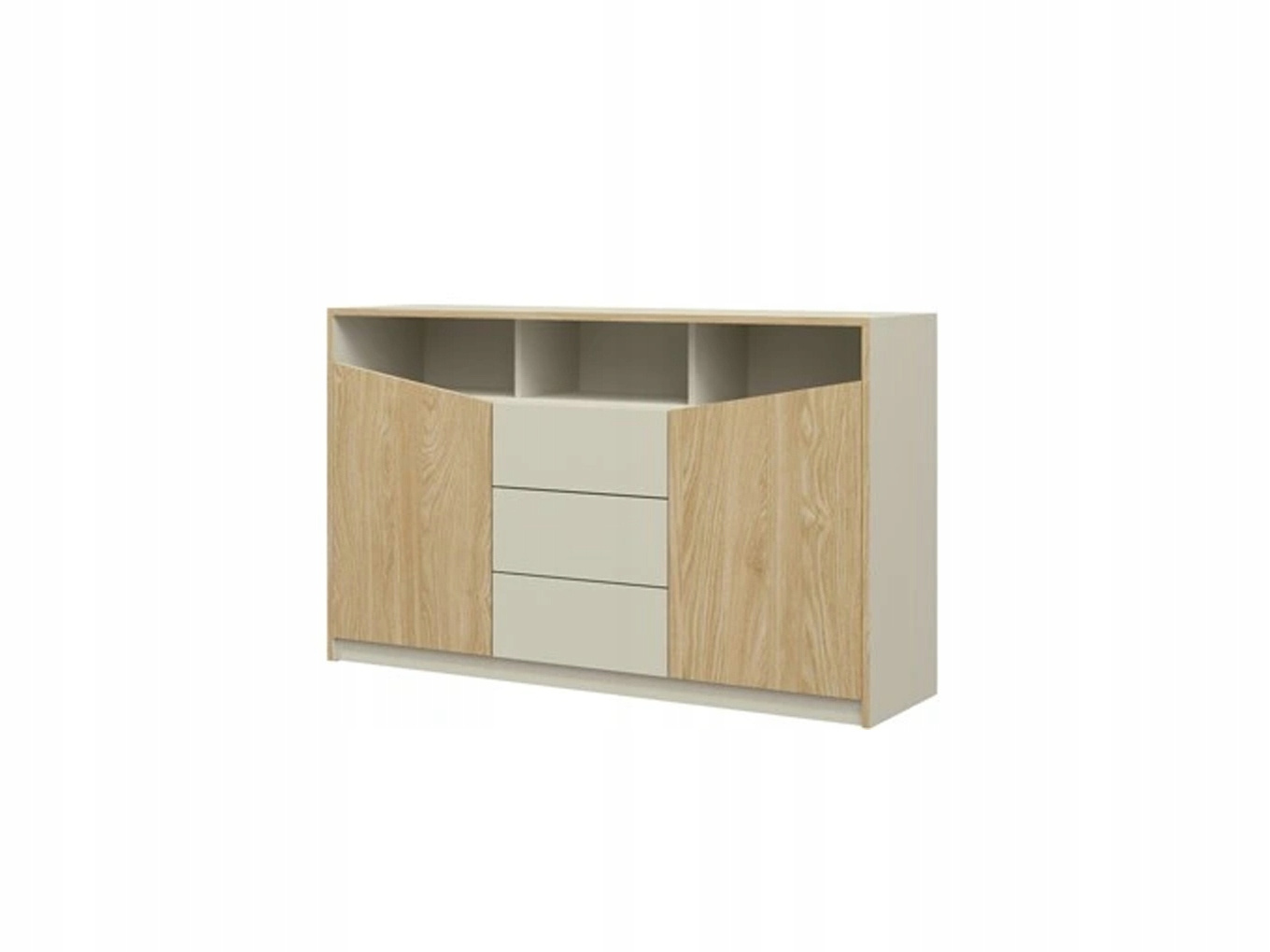 Komoda posiada dwa uchylne fronty oraz trzy szuflady.