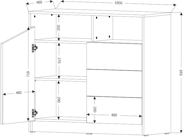 Komoda posiada jeden uchylny front oraz trzy szuflady.
