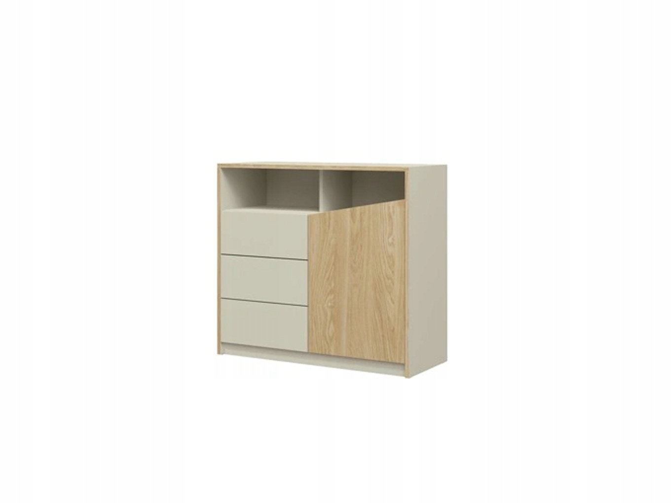 Komoda posiada jeden uchylny front oraz trzy szuflady.