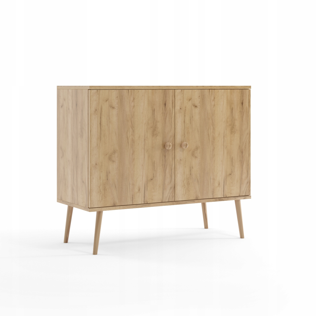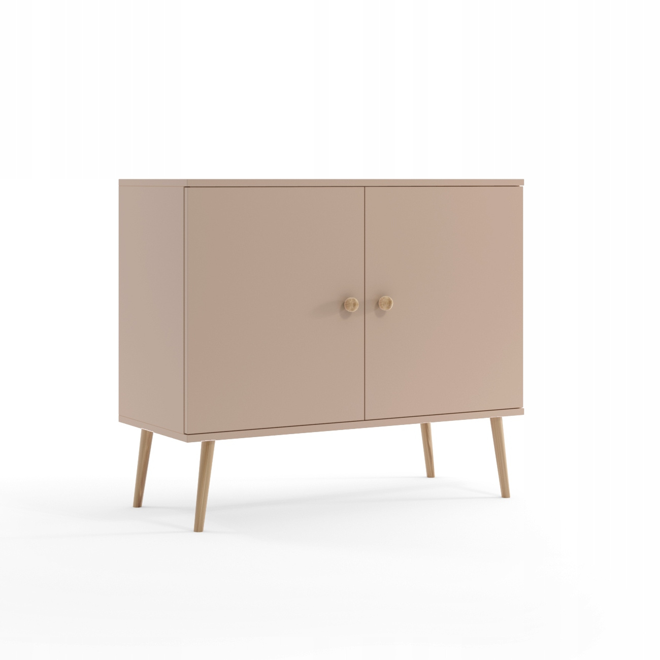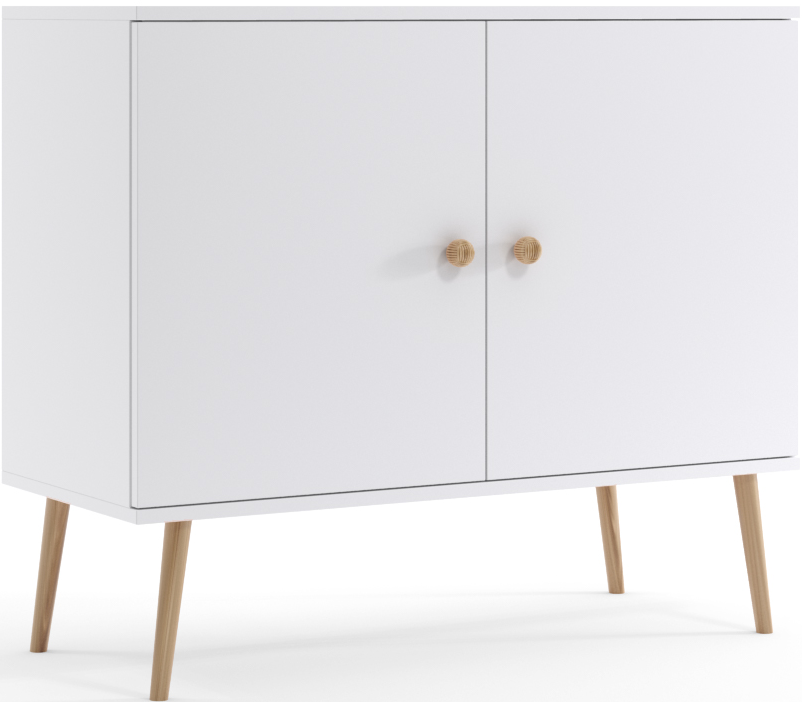 Komoda postawiona na długich, drewnianych nóżkach. Jej skandynawski styl sprawia, że doskonale sprawdzi się zarówno w sypialni jak i w salonie. Posiada dwoje uchylnych drzwiczek z cichym domykiem i sznurkowymi uchwytami. Wewnątrz komody znajdują się regulowane półki, które idealnie zagospodarują przestrzeń.