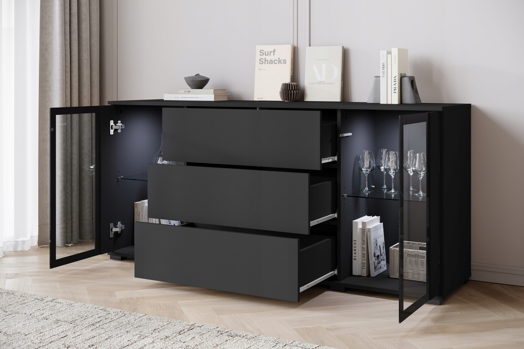 Szklane elementy można podświetlić oświetleniem LED co jeszcze bardziej uatrakcyjni komodę i stworzy idealny klimat w pomieszczeniu.