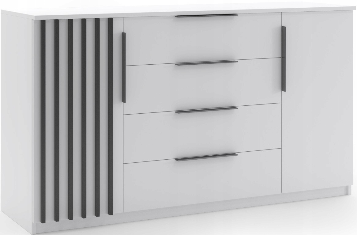 Komoda posiada drzwiczki uchylne ozdobione efektownymi lamelami, po środku znajdują się cztery szuflady, a prawe drzwiczki są w kolorze czarny mat.