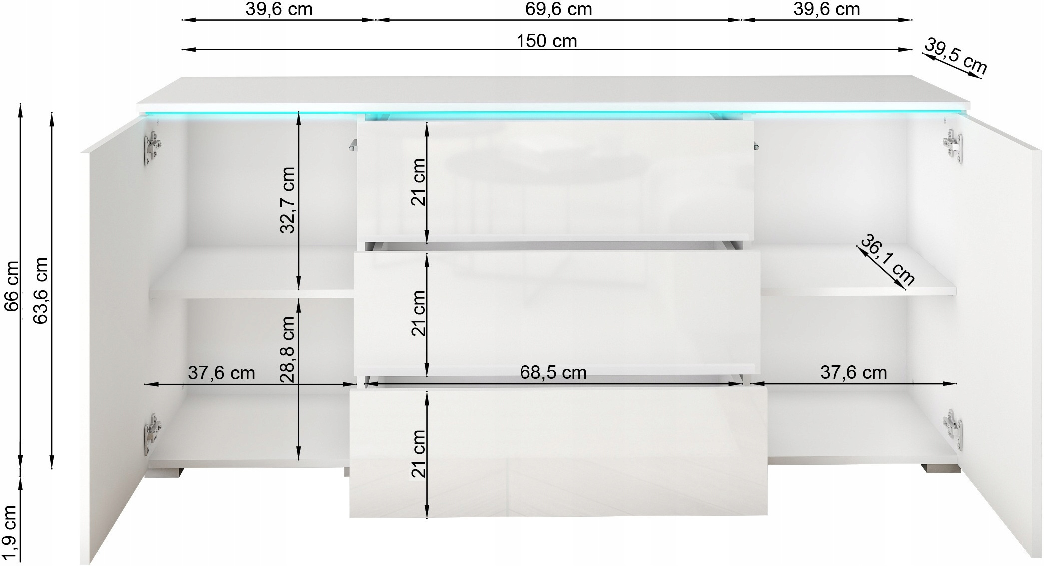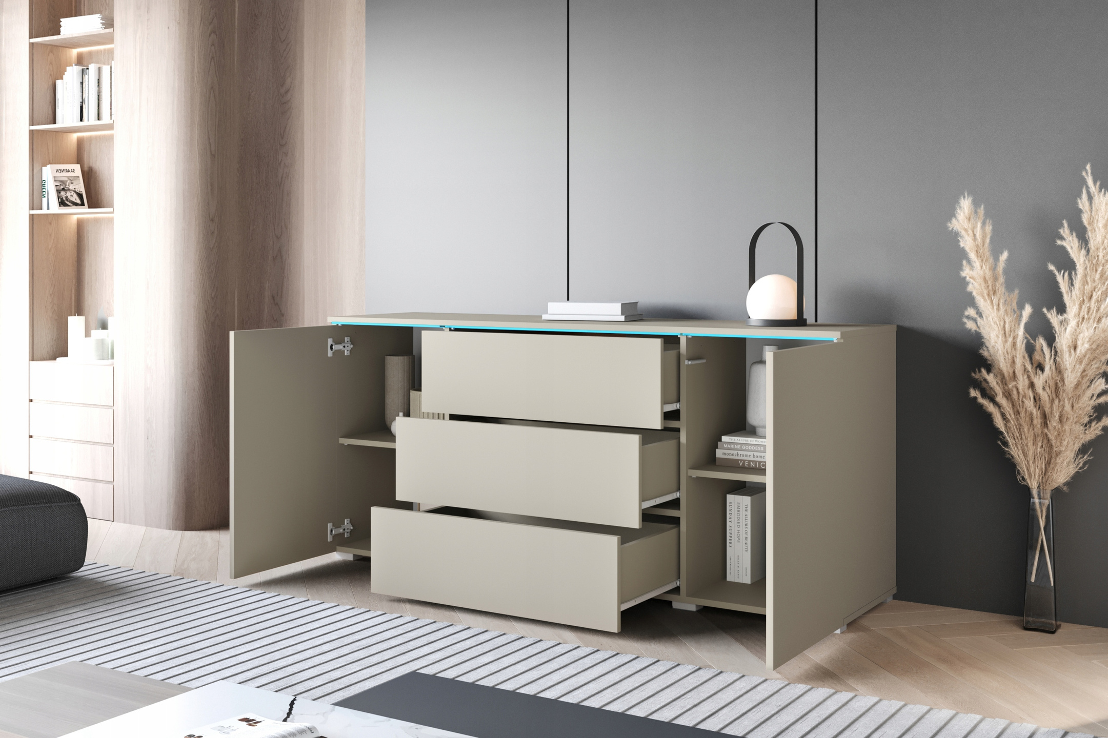 Szklane elementy można podświetlić oświetleniem LED co jeszcze bardziej uatrakcyjni komodę i stworzy idealny klimat w pomieszczeniu.