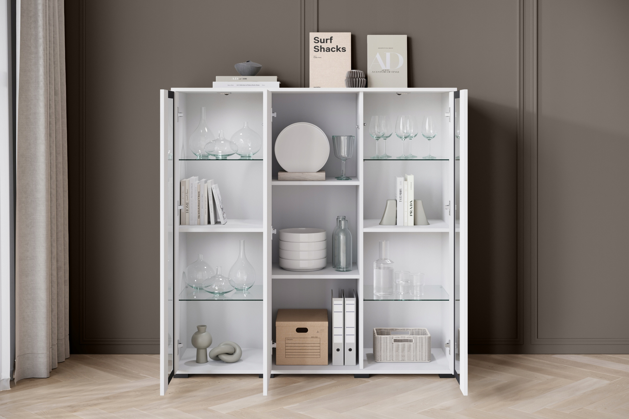 Szklane elementy można podświetlić oświetleniem LED co jeszcze bardziej uatrakcyjni komodę i stworzy idealny klimat w pomieszczeniu.