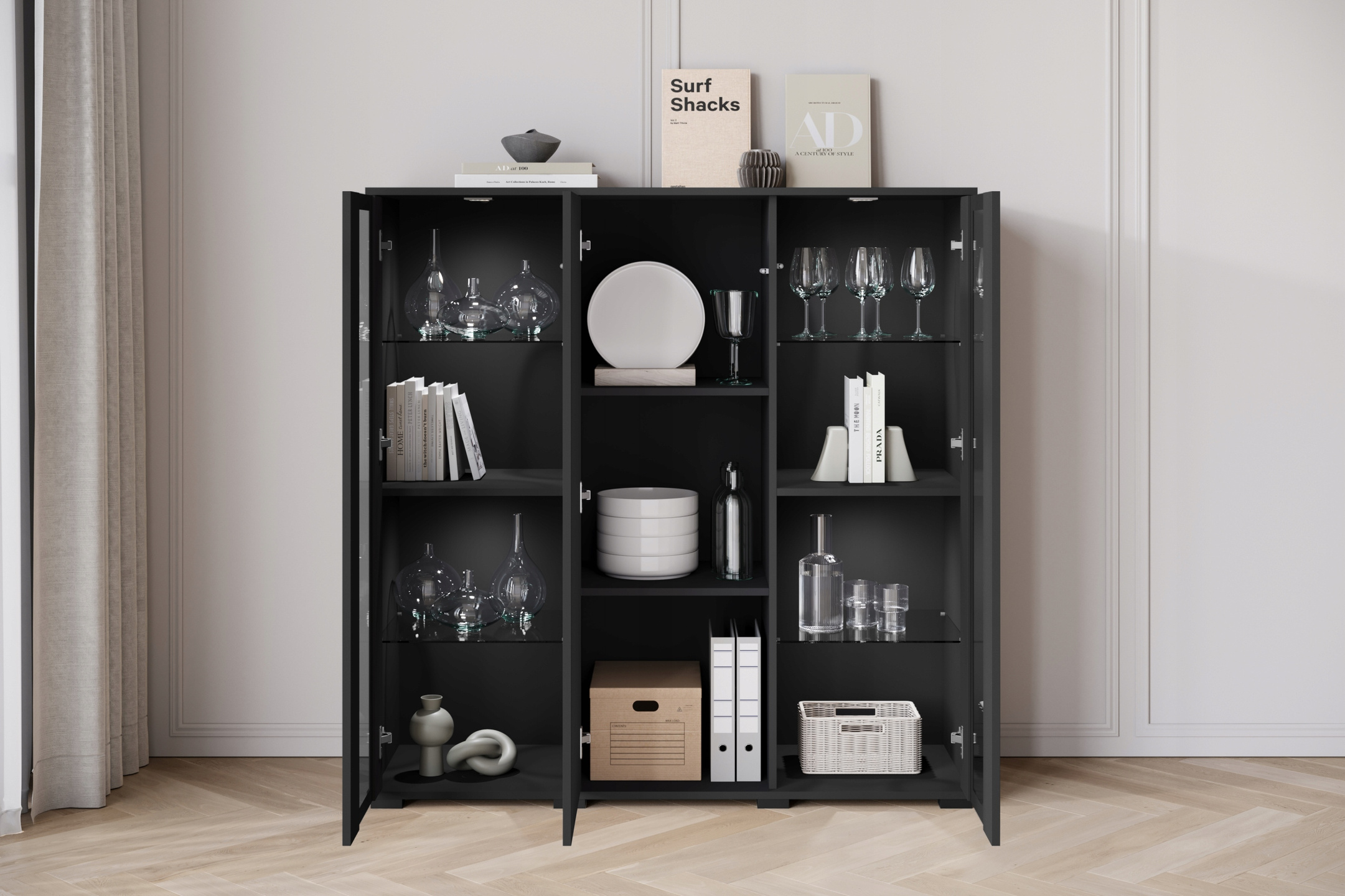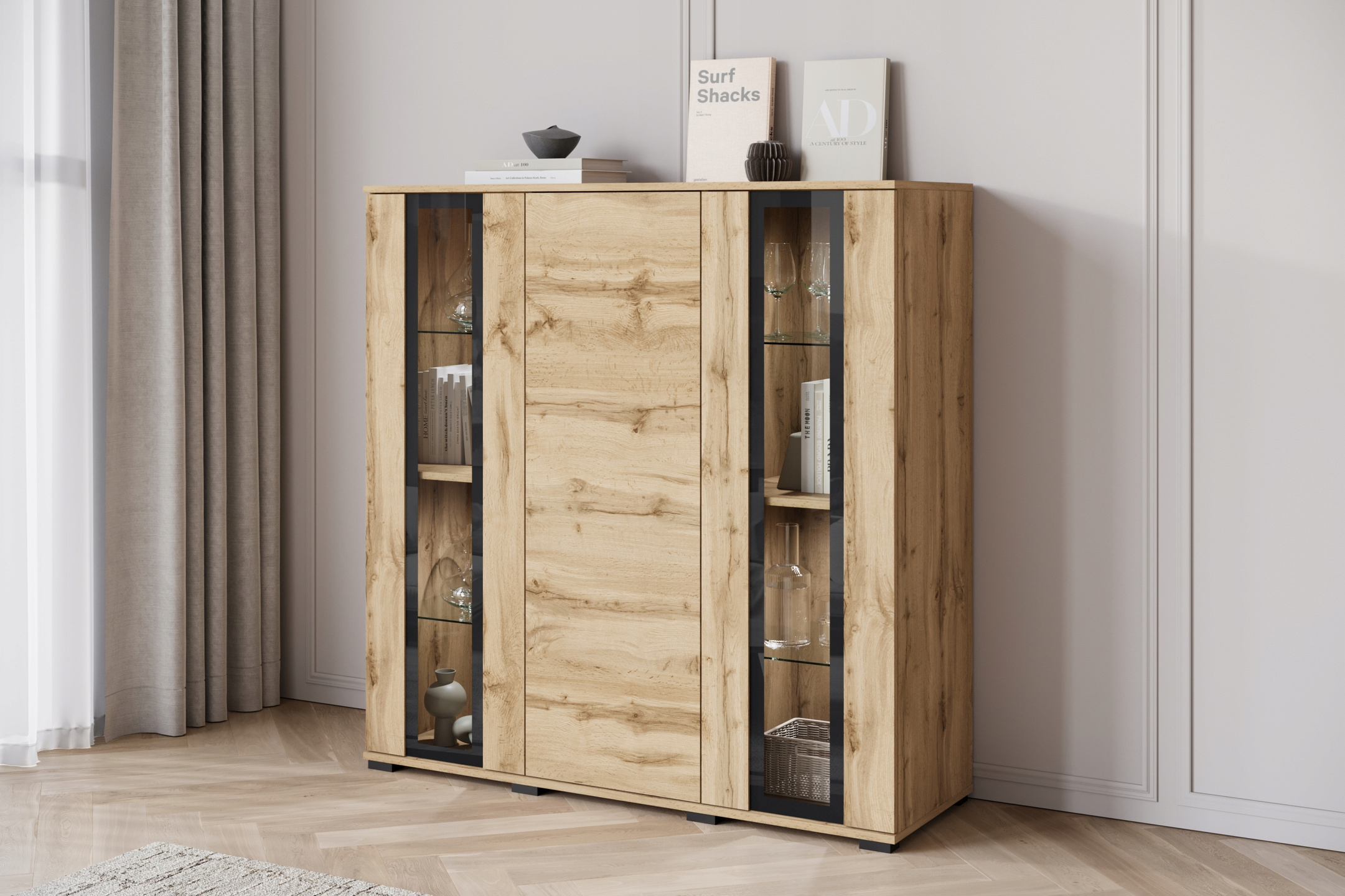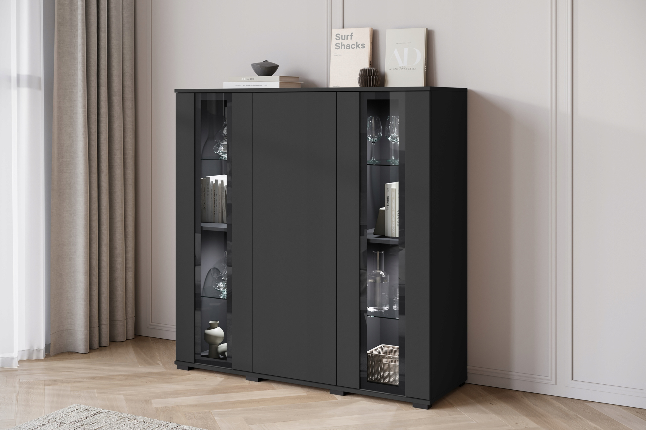 Szklane elementy można podświetlić oświetleniem LED co jeszcze bardziej uatrakcyjni komodę i stworzy idealny klimat w pomieszczeniu.
