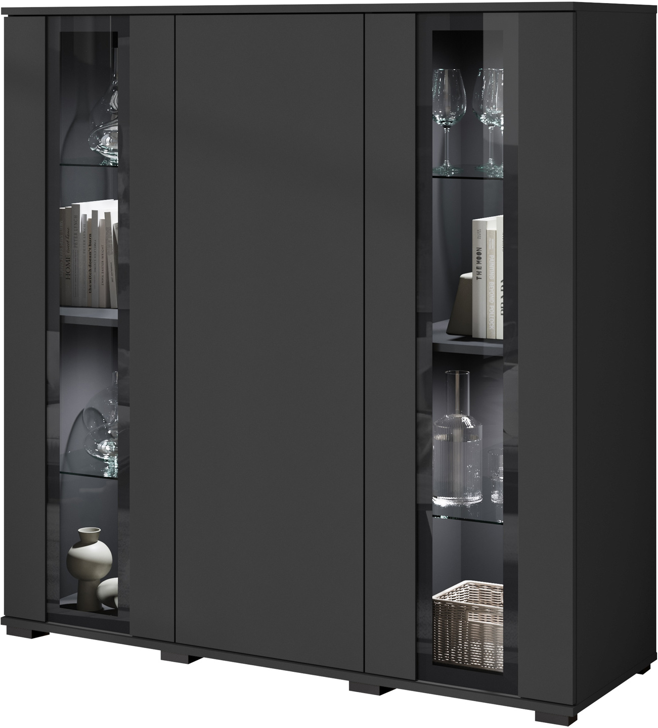 Szklane elementy można podświetlić oświetleniem LED co jeszcze bardziej uatrakcyjni komodę i stworzy idealny klimat w pomieszczeniu.