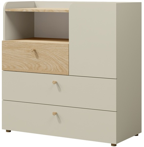 Komoda postawiona na nóżkach z tworzywa, posiada jeden uchylny front oraz trzy szuflady. W lewej części znajdują się otwarte półki a w prawej części półki zamykane frontem.