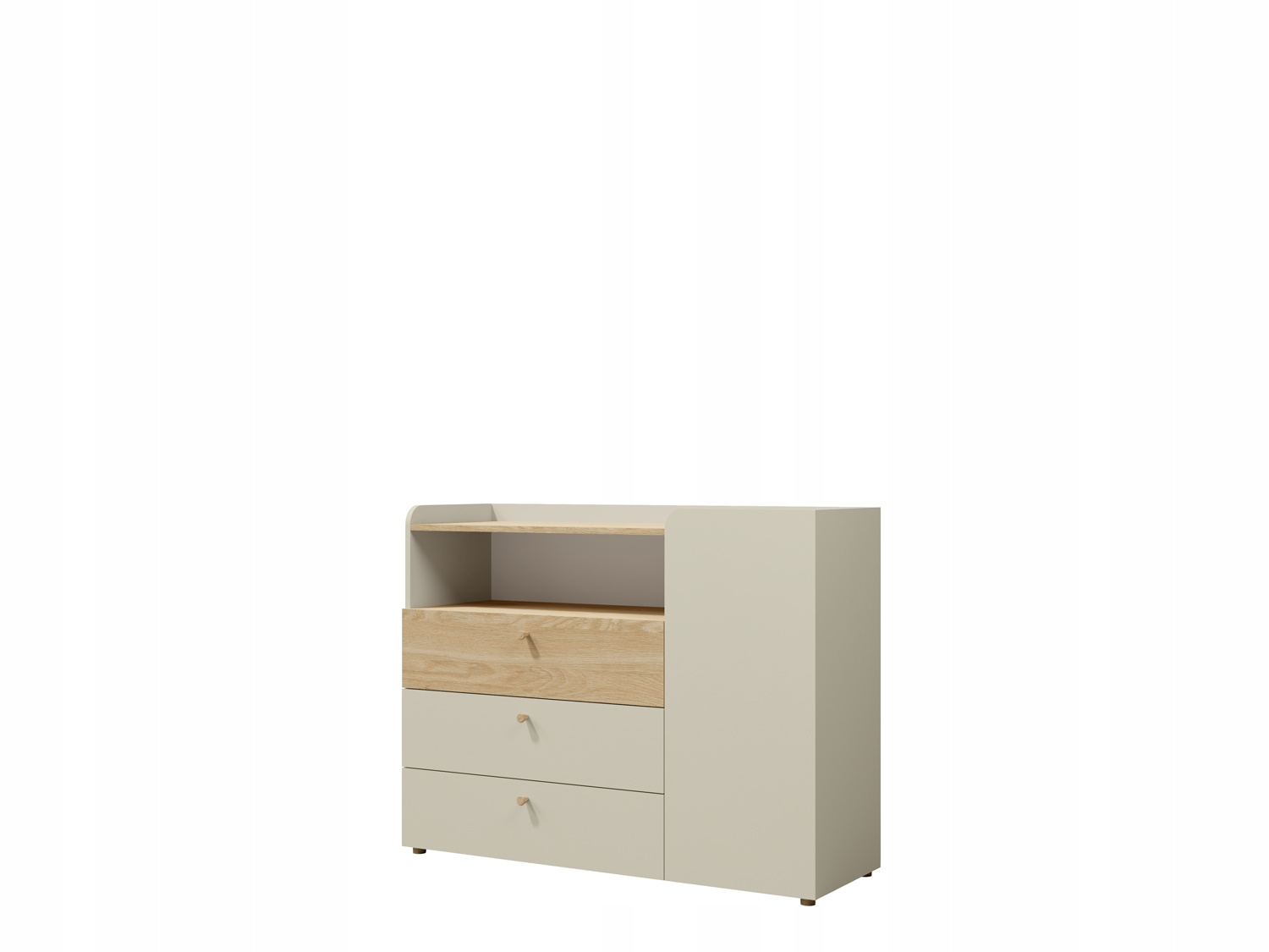 Komoda posiada jeden uchylny front oraz trzy szuflady. W lewej części znajdują się otwarte półki, a w prawej części półki zamykane frontem.