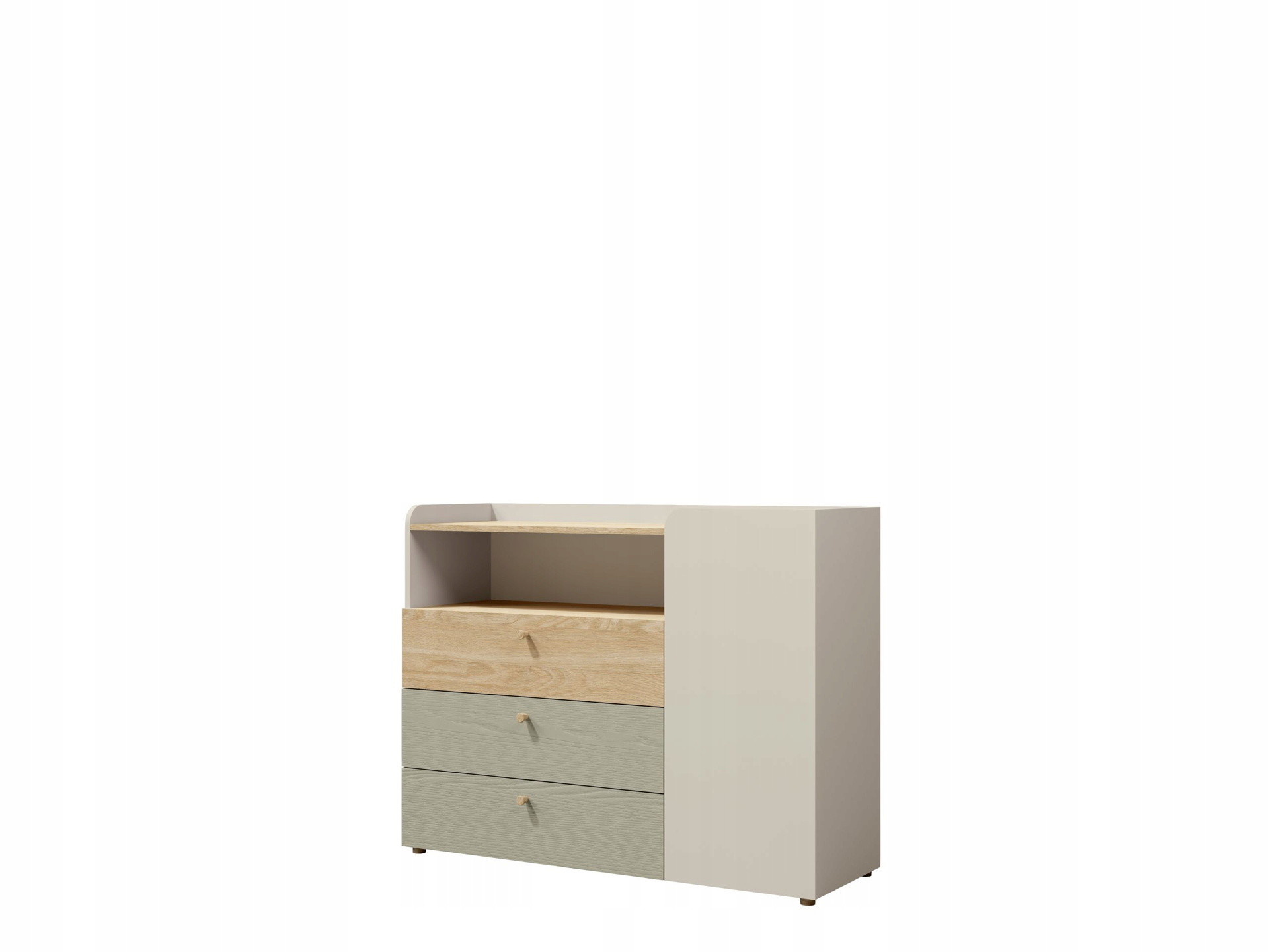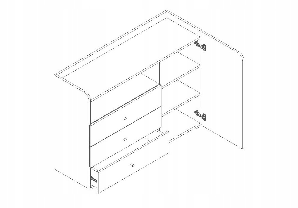 Komoda posiada jeden uchylny front oraz trzy szuflady. W lewej części znajdują się otwarte półki, a w prawej części półki zamykane frontem.