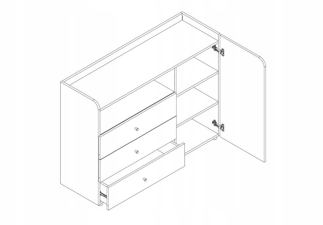 Komoda posiada jeden uchylny front oraz trzy szuflady. W lewej części znajdują się otwarte półki, a w prawej części półki zamykane frontem.