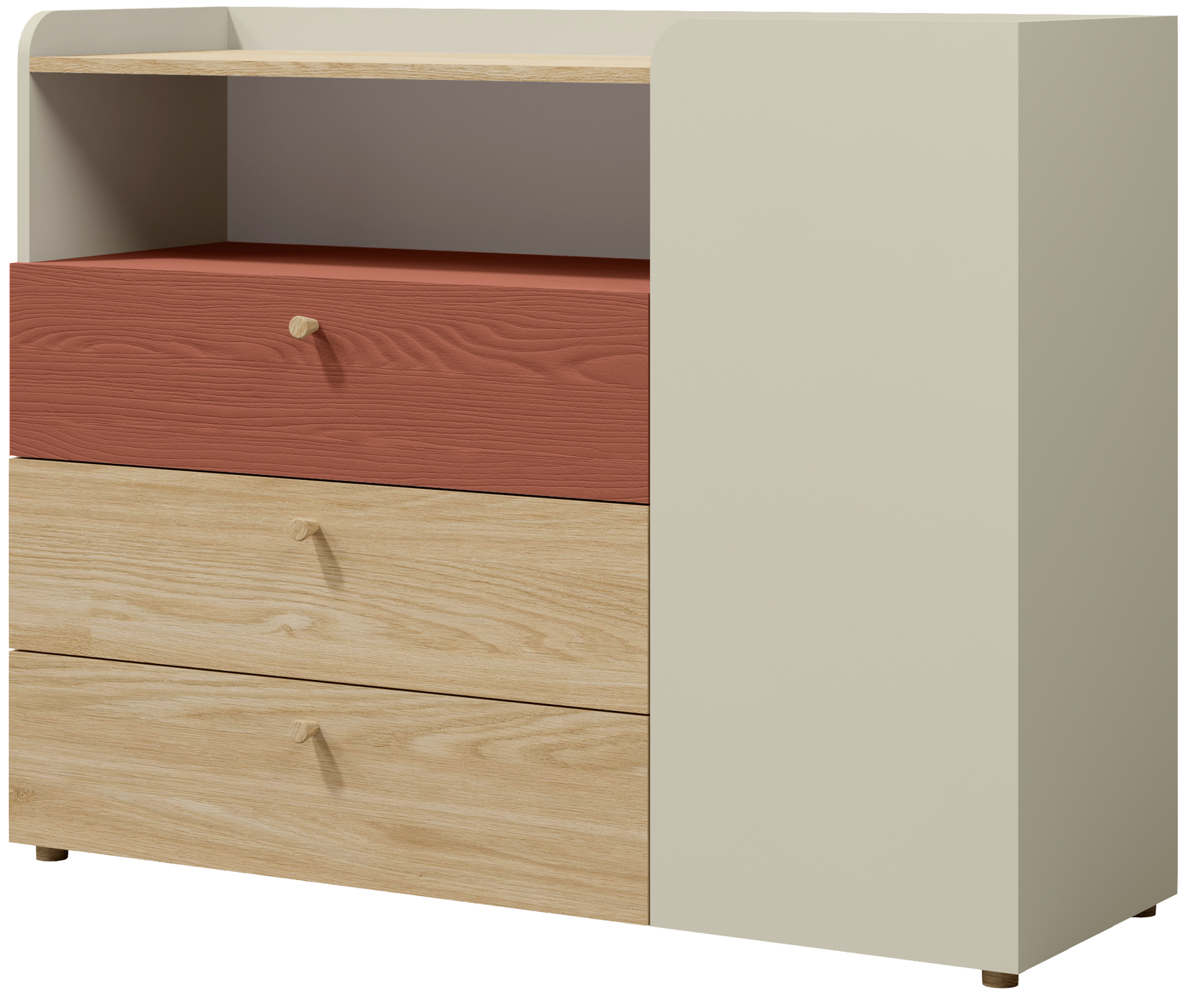 Komoda posiada jeden uchylny front oraz trzy szuflady. W lewej części znajdują się otwarte półki, a w prawej części półki zamykane frontem.