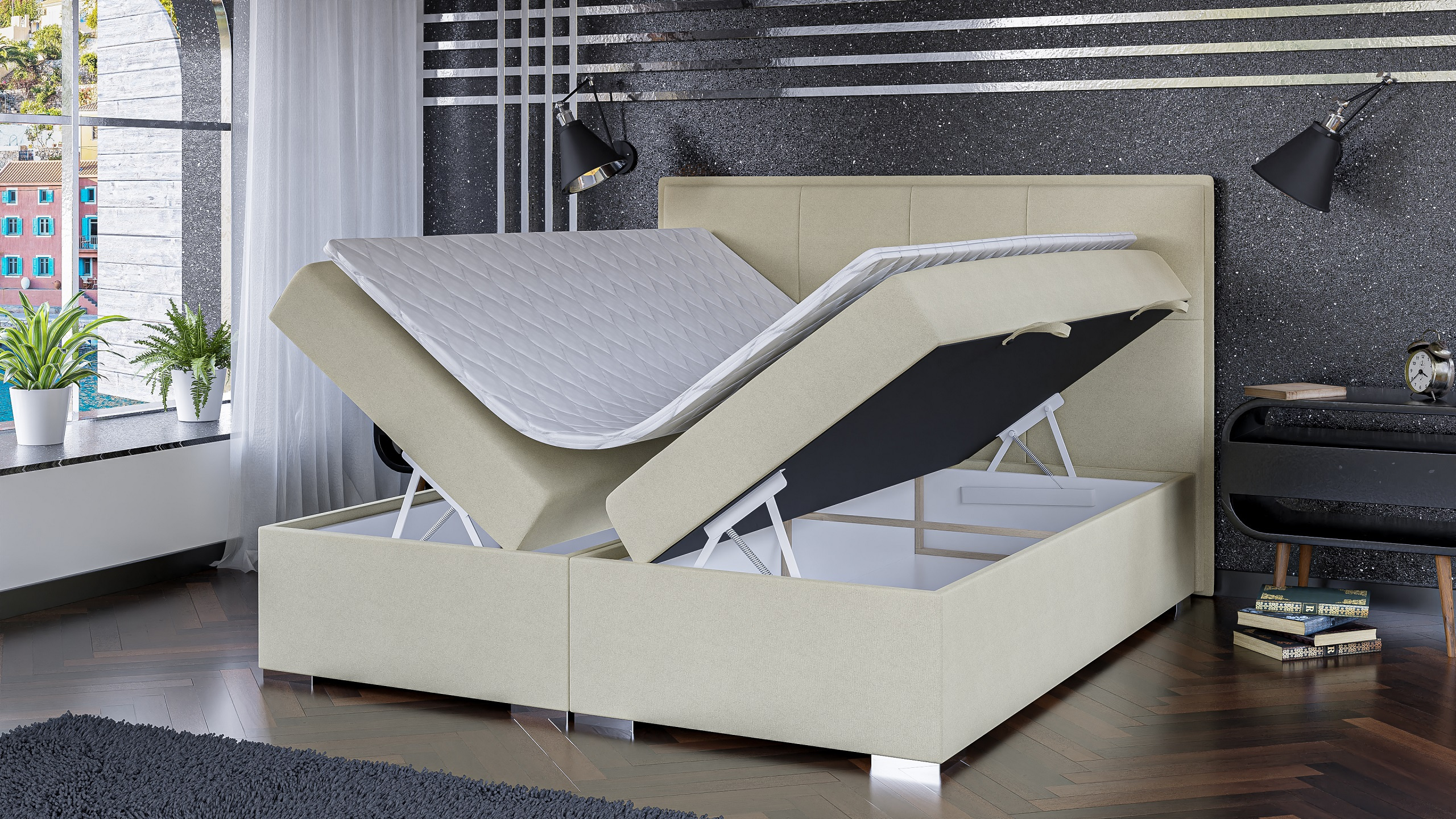 - podstawa łóżka to skrzynia z pojemnikami na pościel otwieranymi na boki wraz z automatami wspomagającymi otwieranie