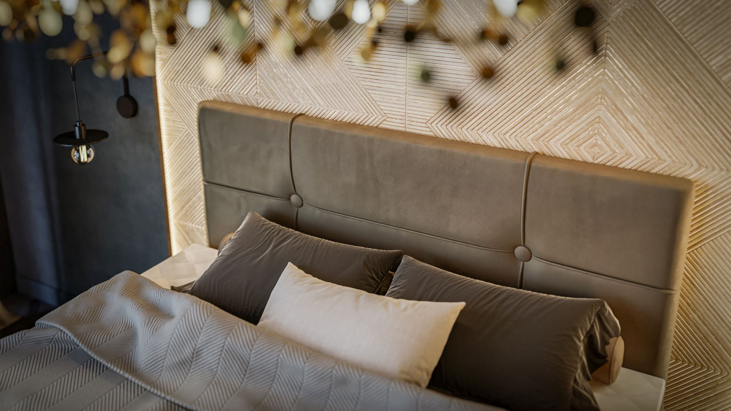 - wezgłowie w łóżku jest przeszywane w pionie i poziomie kedrą i pikowane dwoma guzikami o średnicy 5 cm w tkaninie z korpusu (istnieje możliwość wyboru innej tkaniny na guziki)