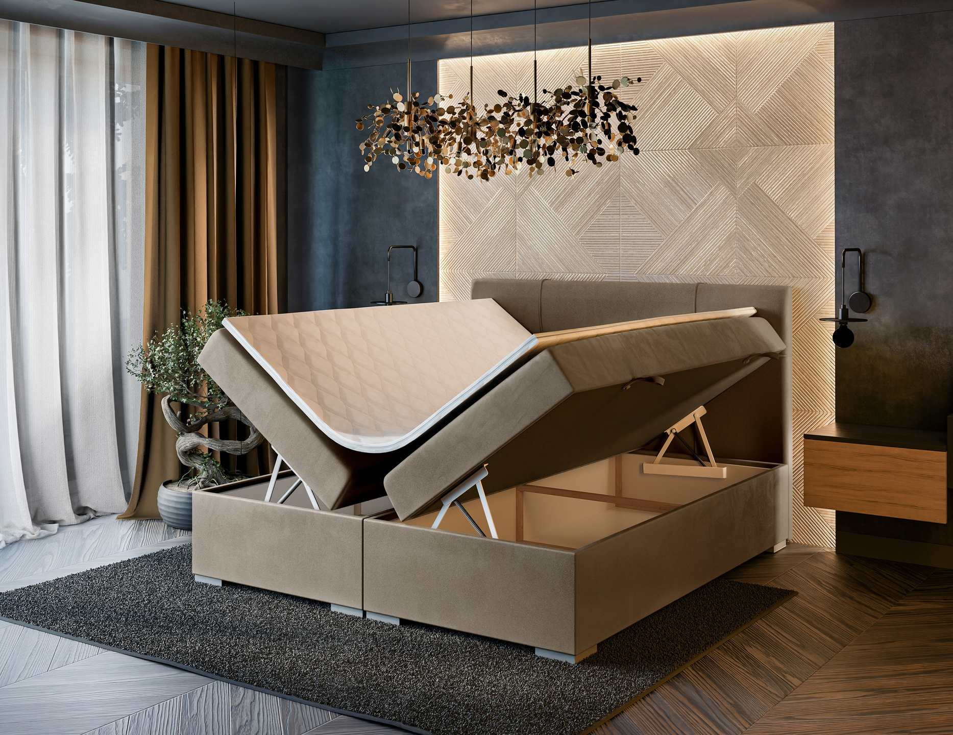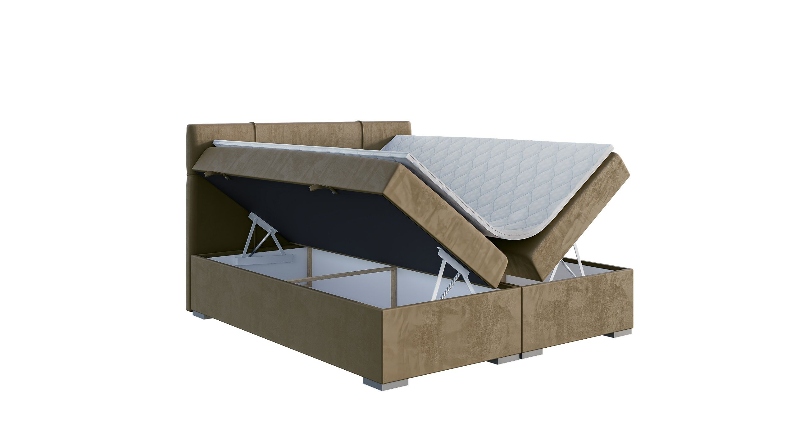 - podstawa łóżka to skrzynia z pojemnikami na pościel otwieranymi na boki wraz z automatami wspomagającymi otwieranie