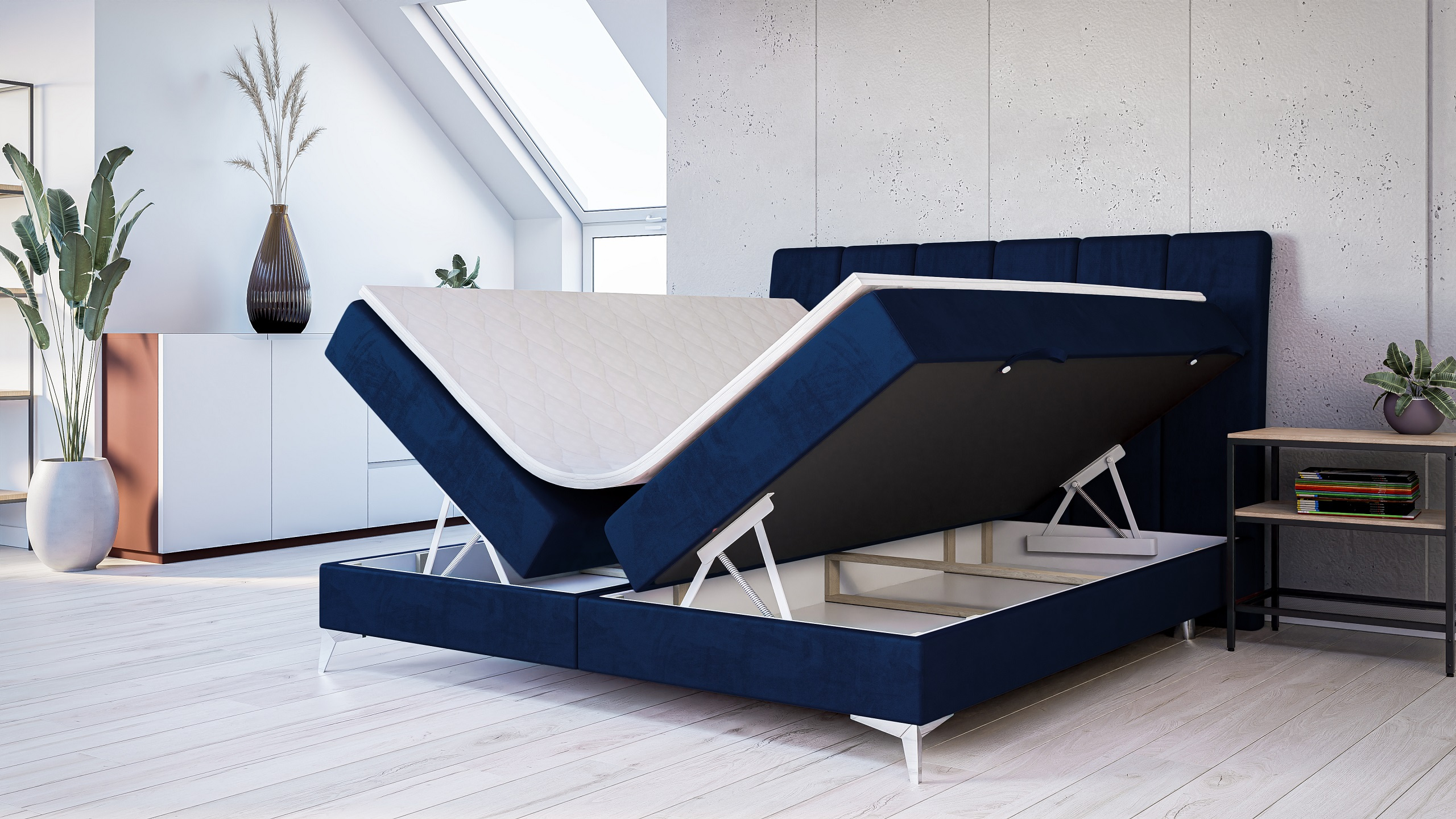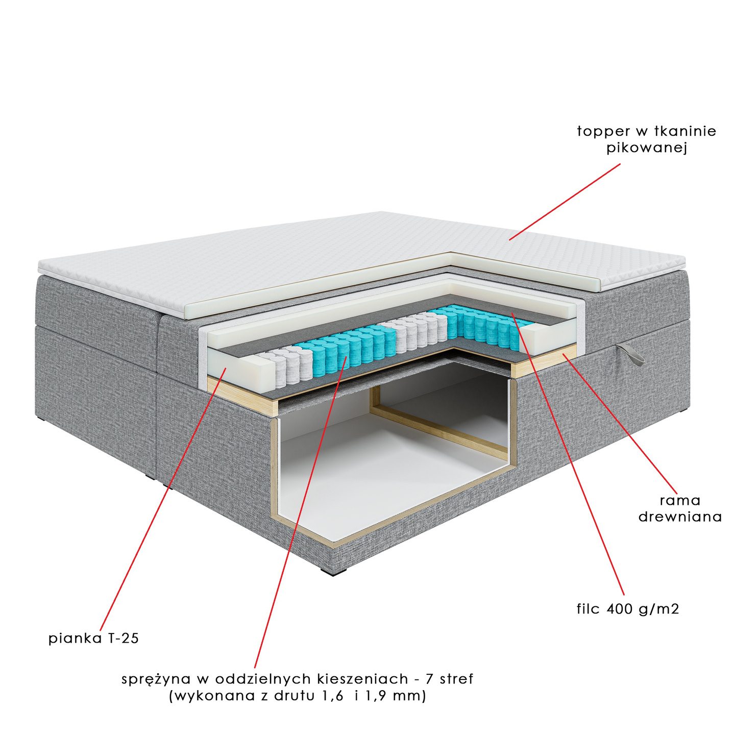 • podstawa łóżka to skrzynia z pojemnikami na pościel otwieranymi na boki wraz z automatami wspomagającymi otwieranie