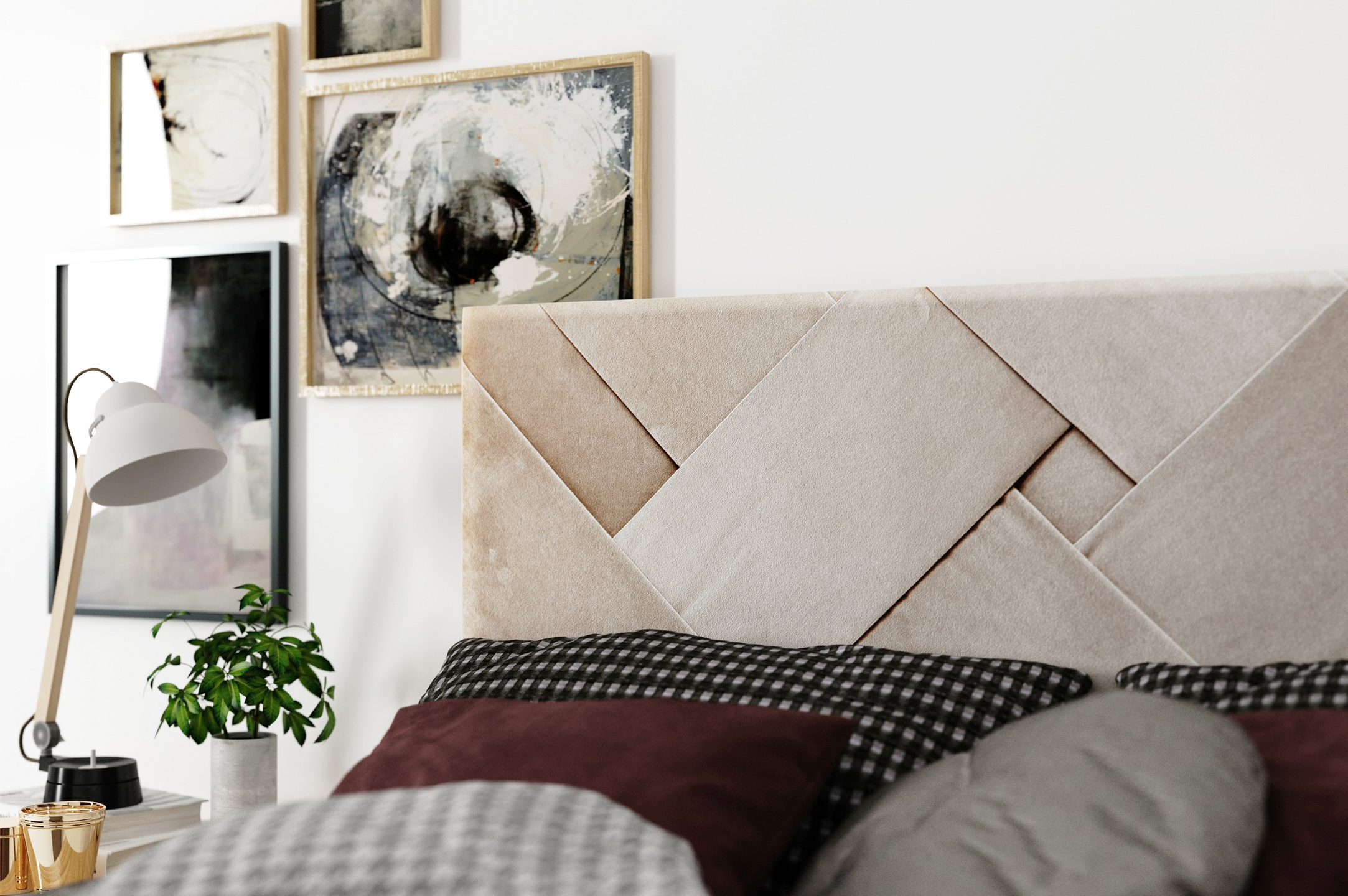 • Łóżko z nietuzinkowym zastosowaniem szali z tkaniny na wezgłowiu. Dostępne w kilku rozmiarach.