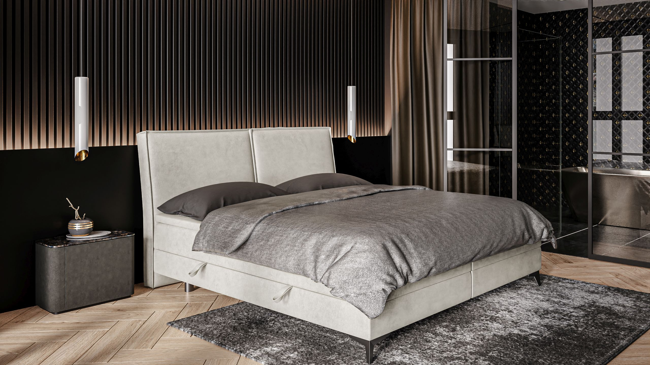 - podstawa łóżka to skrzynia z pojemnikami na pościel otwieranymi na boki wraz z automatami wspomagającymi otwieranie