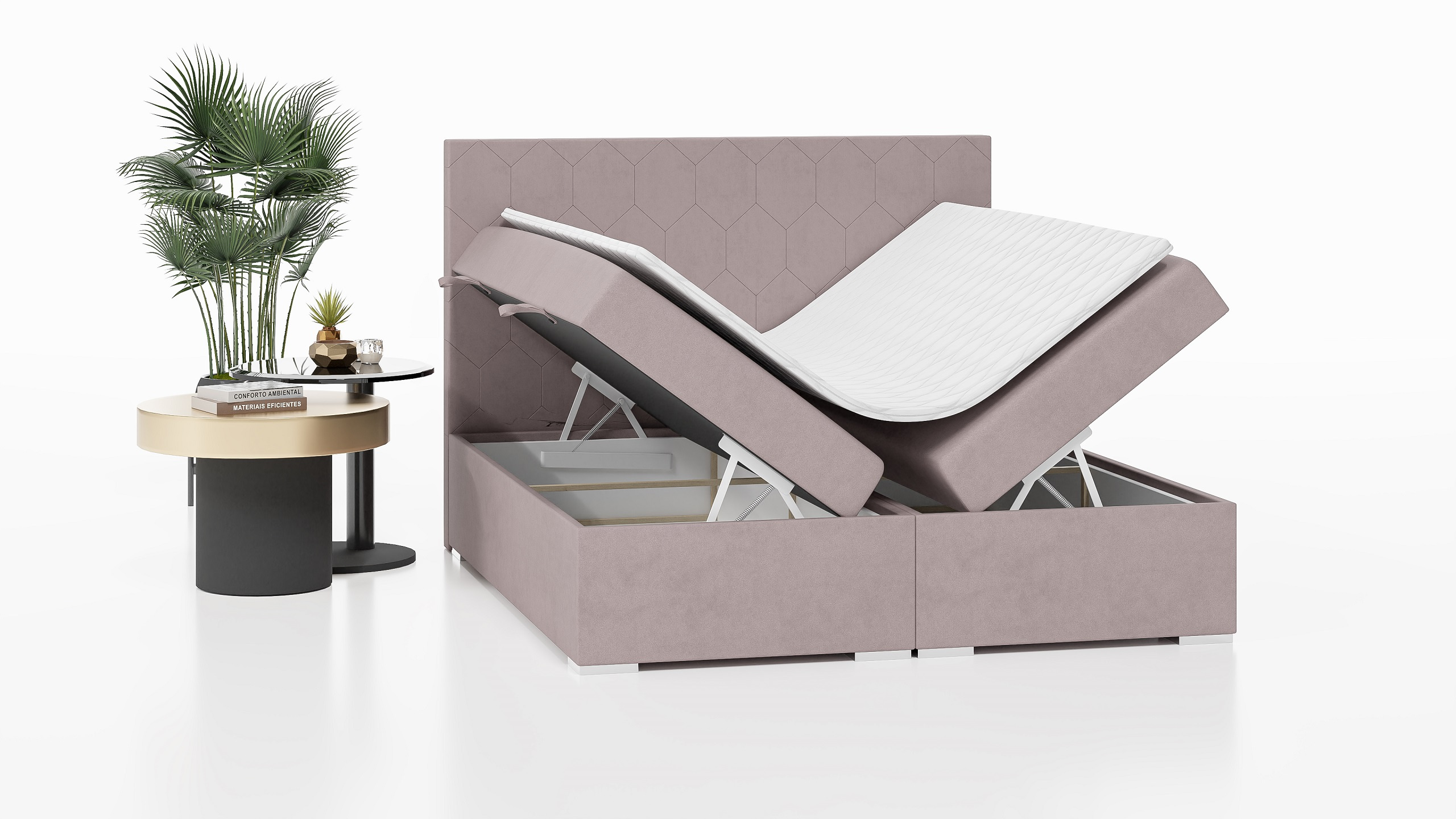 - podstawa łóżka to skrzynia z pojemnikami na pościel otwieranymi na boki wraz z automatami wspomagającymi otwieranie