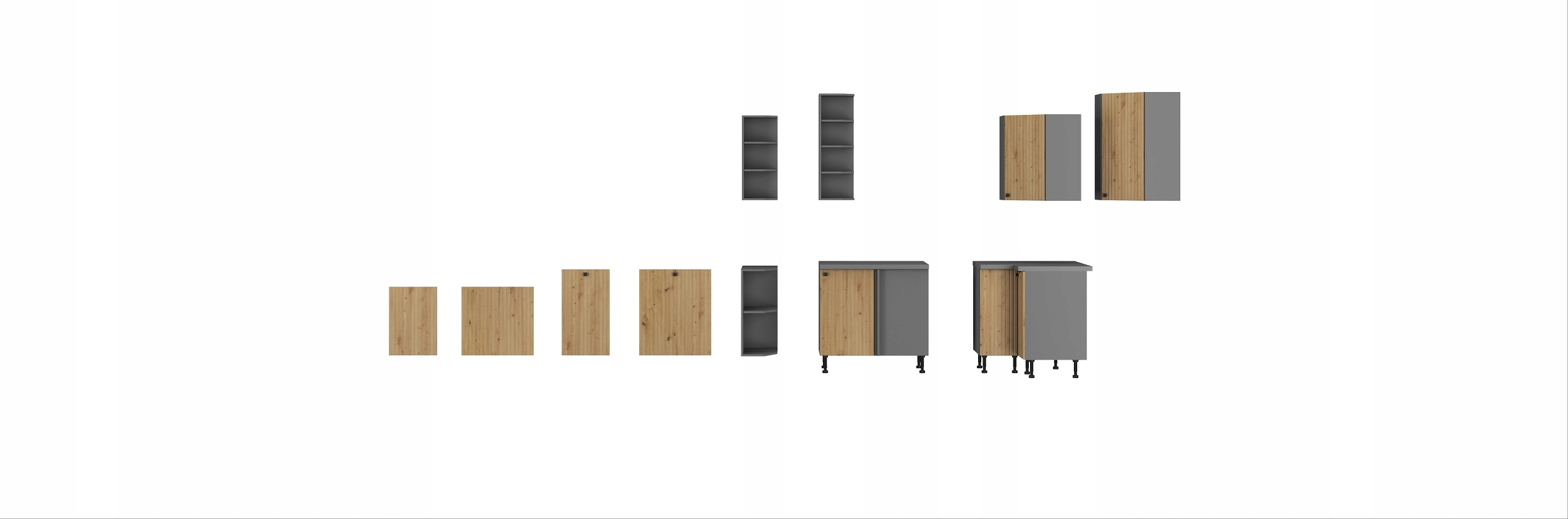 Aukcja dotyczy zestawu ośmiu szafek AVA + NESSA (260cm) w kolorze Dąb Artisan/Antracyt