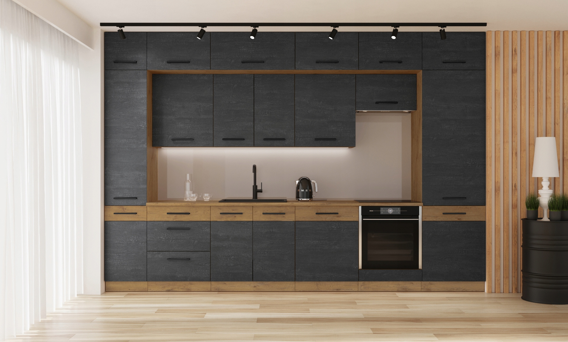 Aukcja dotyczy zestawu szesnastu szafek VIGO w kolorze Dąb Lancelot + Dark Wood (360cm)