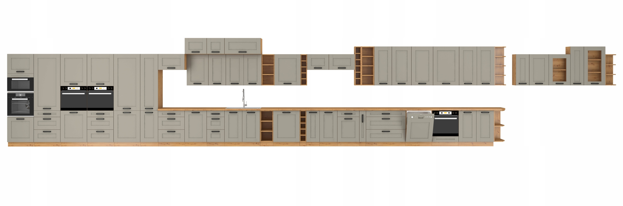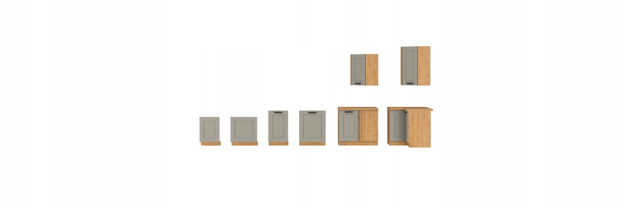 Aukcja dotyczy zestawu dziewięciu szafek LUNA w kolorze Clay Grey/Dąb Artisan
