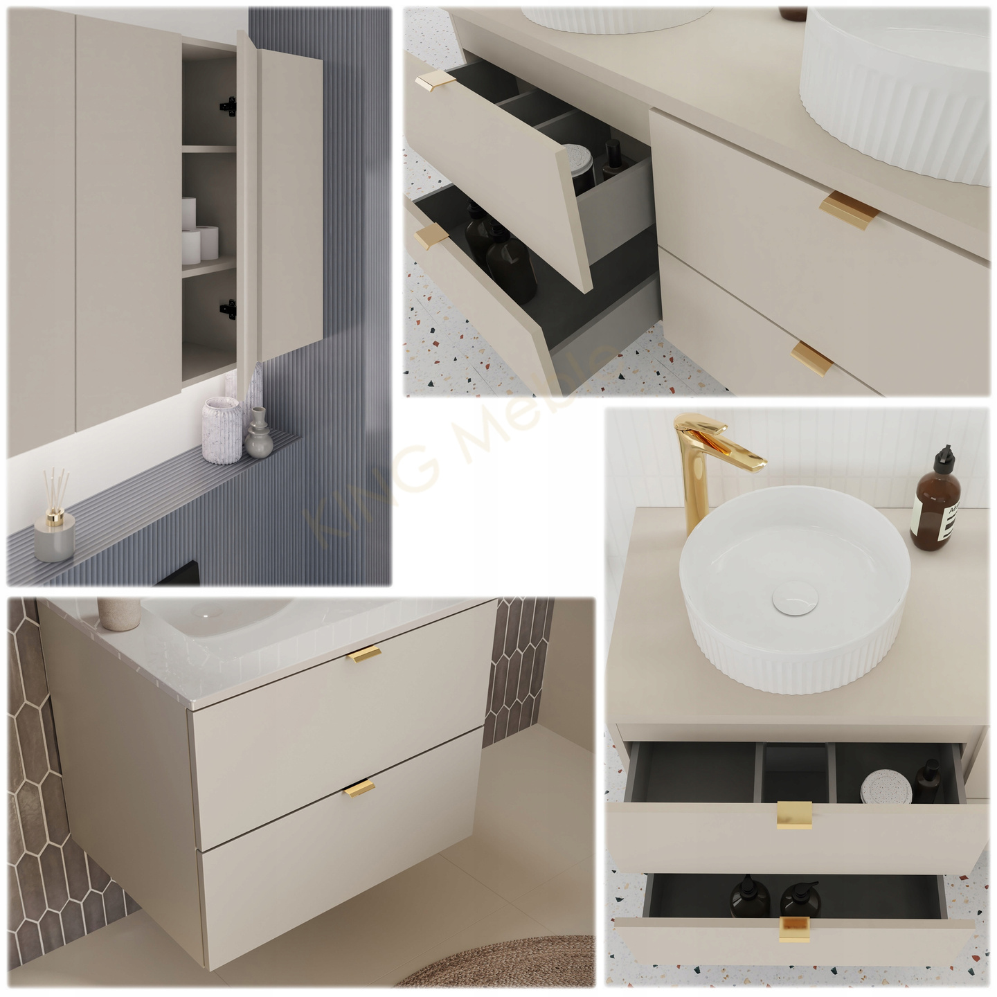 Kolekcja Dalia Cashmere to kwintesencja minimalistycznego stylu. Gładkie fronty, pozbawione zbędnych ozdobników, zachwycają prostotą, a wykończenie w odcieniu kaszmiru wprowadza do wnętrza łagodną, ciepłą atmosferę. Trzy kolory uchwytów – złoty połysk, chrom połysk oraz czarny mat – pozwalają na personalizację i dostosowanie mebli do indywidualnych preferencji.