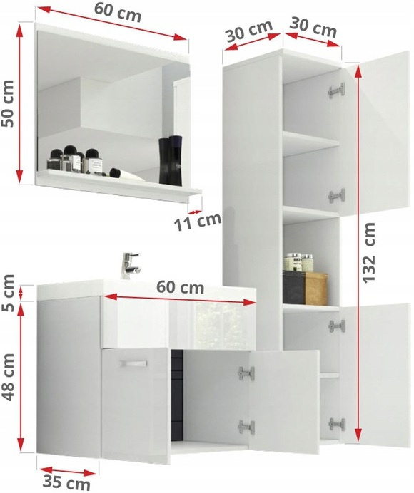 Szafki są pojemne, dzięki czemu możemy do nich schować środki czystości oraz kosmetyki zachowując w pomieszczeniu porządek i estetykę.