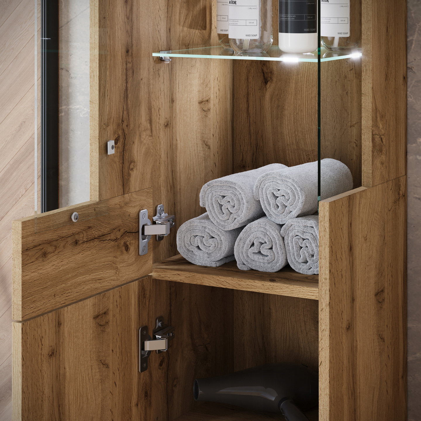 Szafki są pojemne, dzięki czemu możemy do nich schować środki czystości oraz kosmetyki zachowując w pomieszczeniu porządek i estetykę.
