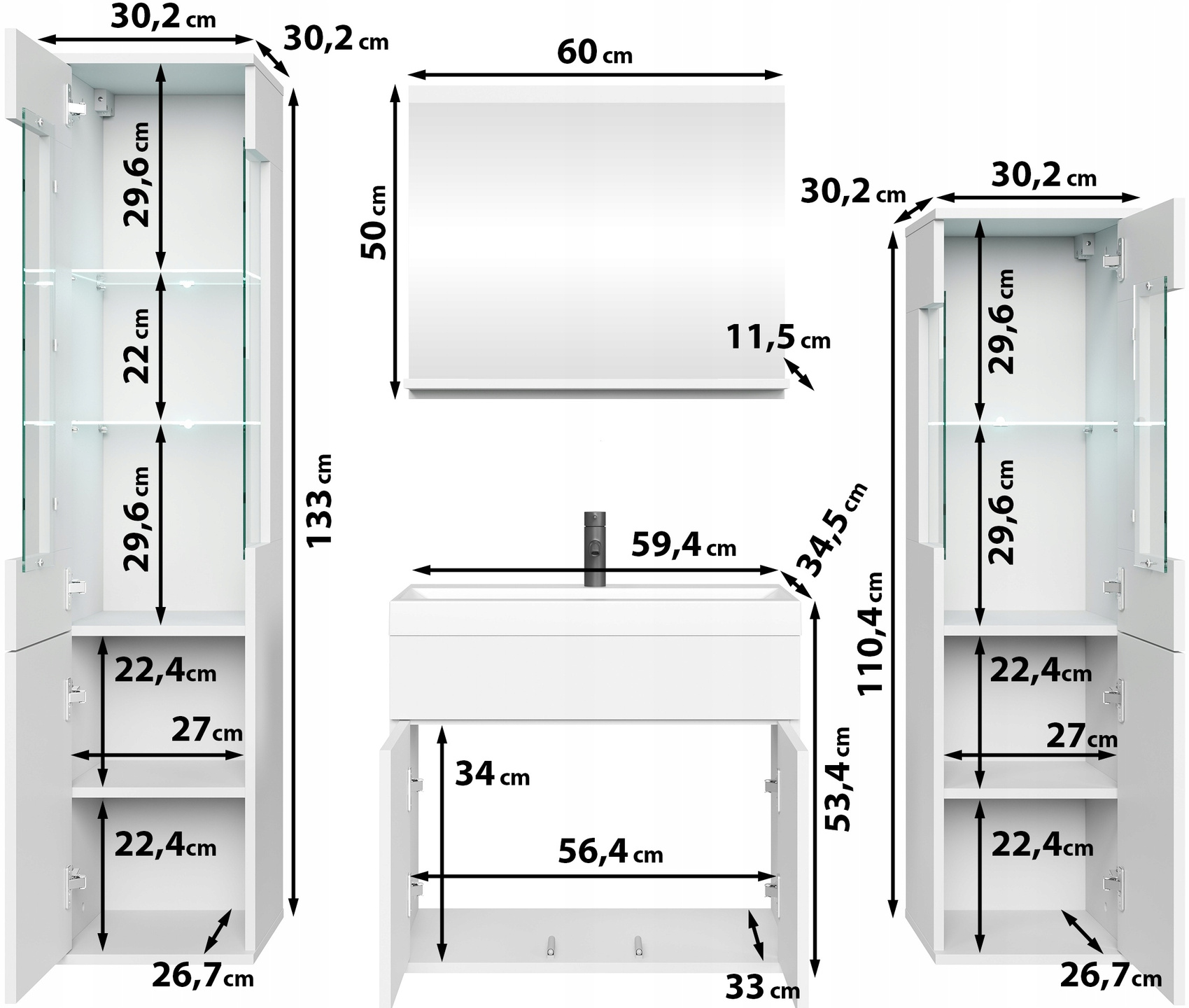 Szafki są pojemne, dzięki czemu możemy do nich schować środki czystości oraz kosmetyki zachowując w pomieszczeniu porządek i estetykę.