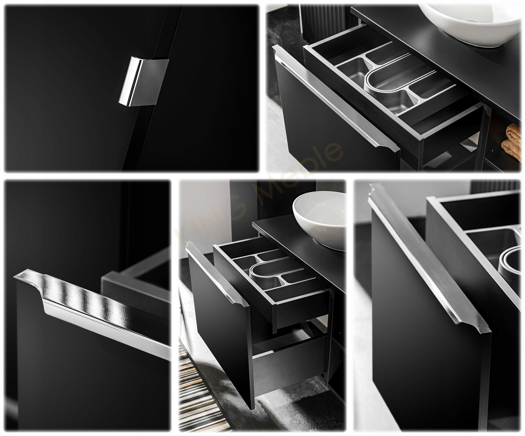 Santa Fe Black to bryły zaprojektowane w nowoczesnym stylu, dzięki czemu z łatwością wkomponują się w niemal każdą aranżację. Fronty oraz korpus w kolorze czarnej orchidei połączone z chromowanymi uchwytami nadają całości lekkości i elegancji. Szafki lustrzane wchodzące w skład kolekcji optycznie powiększa łazienkę oraz zapewnią dodatkową przestrzeń do przechowywania. Meble łazienkowe z kolekcji Santa Fe Black to wygoda użytkowania i funkcjonalność. Wychodząc na przeciw oczekiwaniom naszych Klientów do tej kolekcji dodajemy organizer do szuflady. Jest on funkcjonalny nie tylko z powodu perfekcyjnego ukrycia wycięcia na syfon ale daję również dodatkową przestrzeń użytkową w szufladzie.