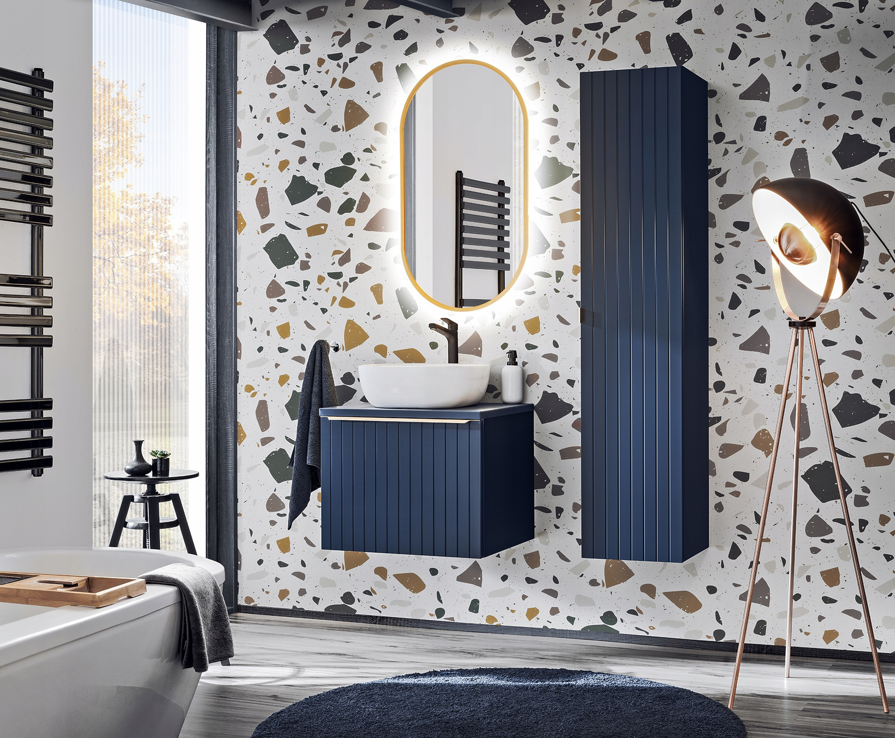 To odważna kolekcja, obok której nie można przejść obojętnie. Głęboki granat połączony z ryflowanymi frontami nadaje całości nietuzinkowego charakteru, dzięki czemu wygląd kolekcji sprosta nawet najbardziej wysublimowanym potrzebom wizualnym. Dopełnieniem kolekcji są złote uchwyty, doskonale wpisujące się w obecne trendy. Z pewnością ożywi każdą łazienkę oraz zachwyci swą elegancją. Luksusowy design i odważna kolorystyka- tak można opisać Santa Fe Deep Blue. Szeroka gama szafek czyni tę kolekcję jedną z najbardziej modułowych w naszej ofercie dzięki czemu wpasuję się do łazienek w niemalże wszystkich wymiarach. Wychodząc na przeciw oczekiwaniom naszych klientów do tej kolekcji dodajemy organizer do szuflady. Jest on funkcjonalny, nie tylko z powodu perfekcyjnego ukrycia wycięcia na syfon, ale daję również dodatkową przestrzeń użytkową w szufladzie. Trzeba pamiętać, że kolekcja została zaprojektowana wyłącznie z myślą o umywalkach nablatowych.