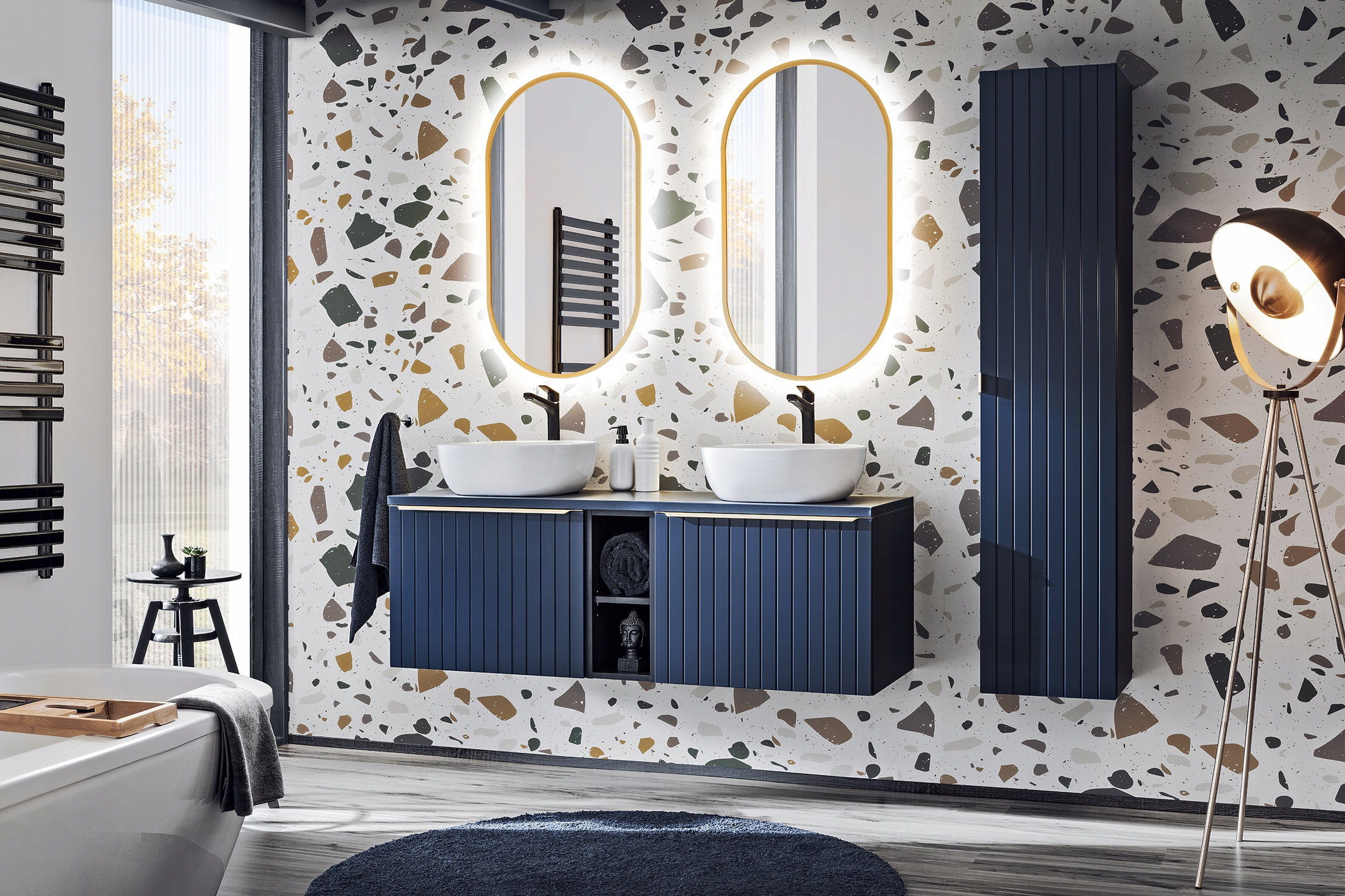 Meble łazienkowe SANTA FE DEEP BLUE 60, Umywalka nablatowa, Lustro LED, INDIGO