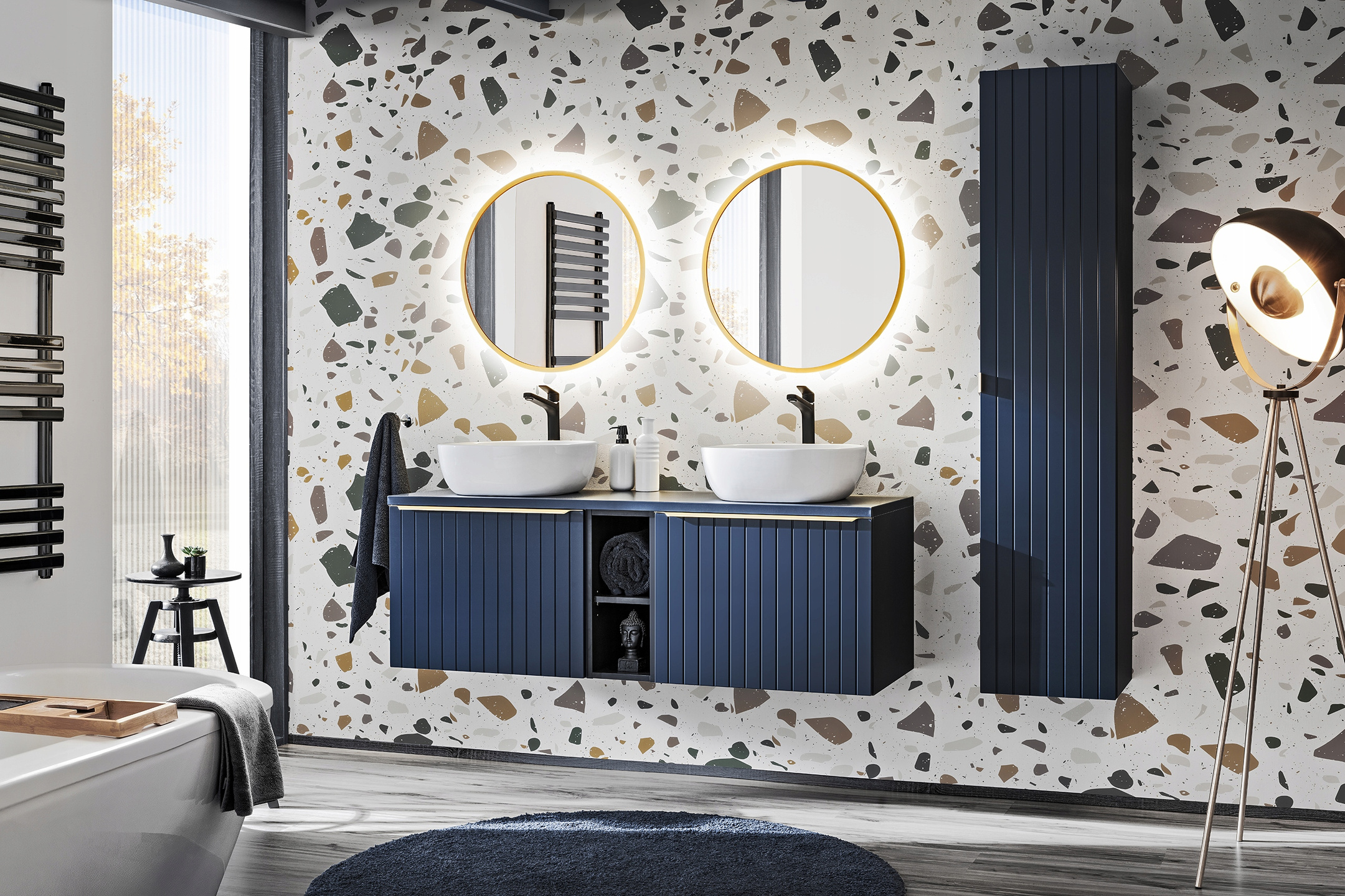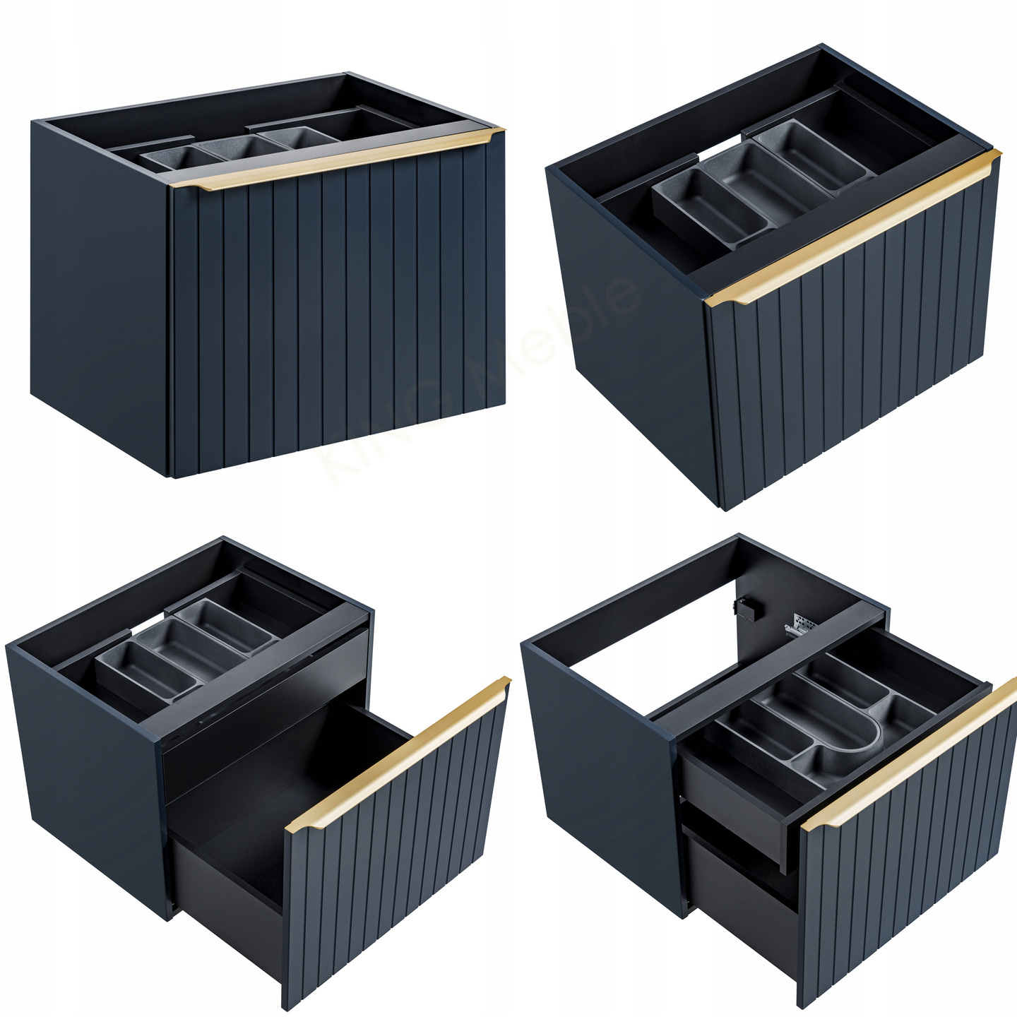 To odważna kolekcja, obok której nie można przejść obojętnie. Głęboki granat połączony z ryflowanymi frontami nadaje całości nietuzinkowego charakteru, dzięki czemu wygląd kolekcji sprosta nawet najbardziej wysublimowanym potrzebom wizualnym. Dopełnieniem kolekcji są złote uchwyty, doskonale wpisujące się w obecne trendy. Z pewnością ożywi każdą łazienkę oraz zachwyci swą elegancją. Luksusowy design i odważna kolorystyka- tak można opisać Santa Fe Deep Blue. Szeroka gama szafek czyni tę kolekcję jedną z najbardziej modułowych w naszej ofercie dzięki czemu wpasuję się do łazienek w niemalże wszystkich wymiarach. Wychodząc na przeciw oczekiwaniom naszych klientów do tej kolekcji dodajemy organizer do szuflady. Jest on funkcjonalny, nie tylko z powodu perfekcyjnego ukrycia wycięcia na syfon, ale daję również dodatkową przestrzeń użytkową w szufladzie. Trzeba pamiętać, że kolekcja została zaprojektowana wyłącznie z myślą o umywalkach nablatowych.