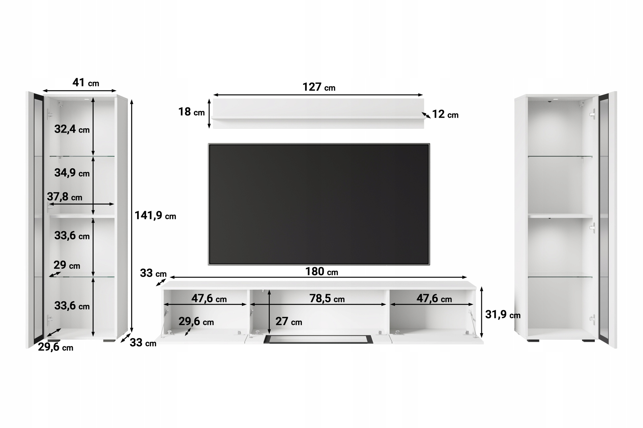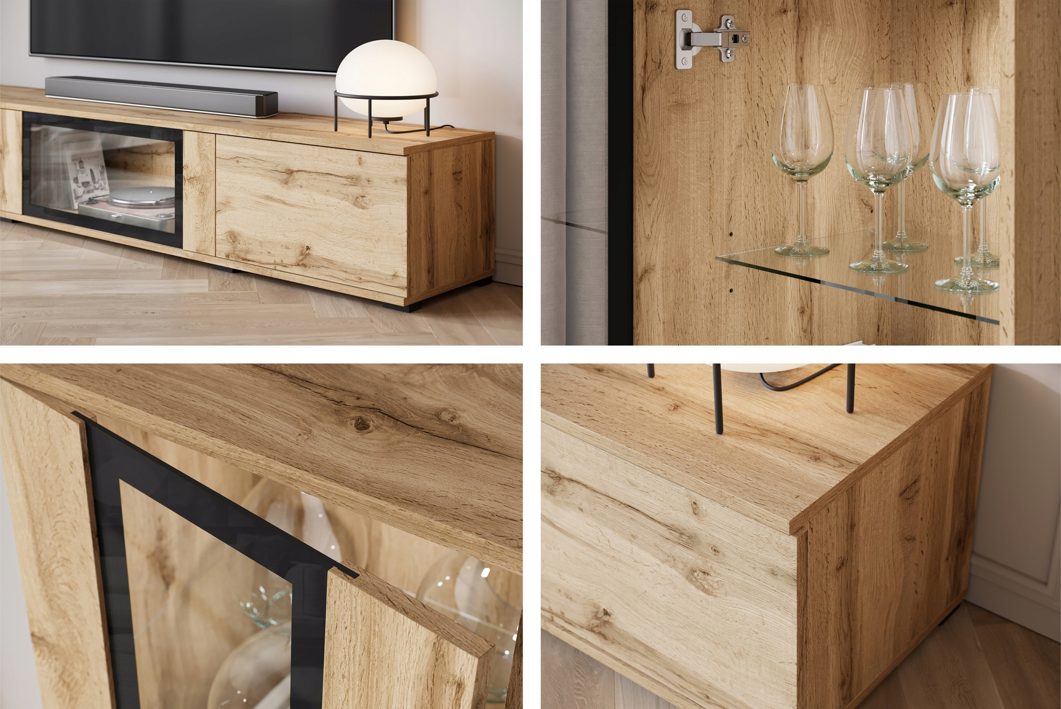 Szklane elementy można podświetlić oświetleniem LED co jeszcze bardziej uatrakcyjni mebel i stworzy idealny klimat w pomieszczeniu.