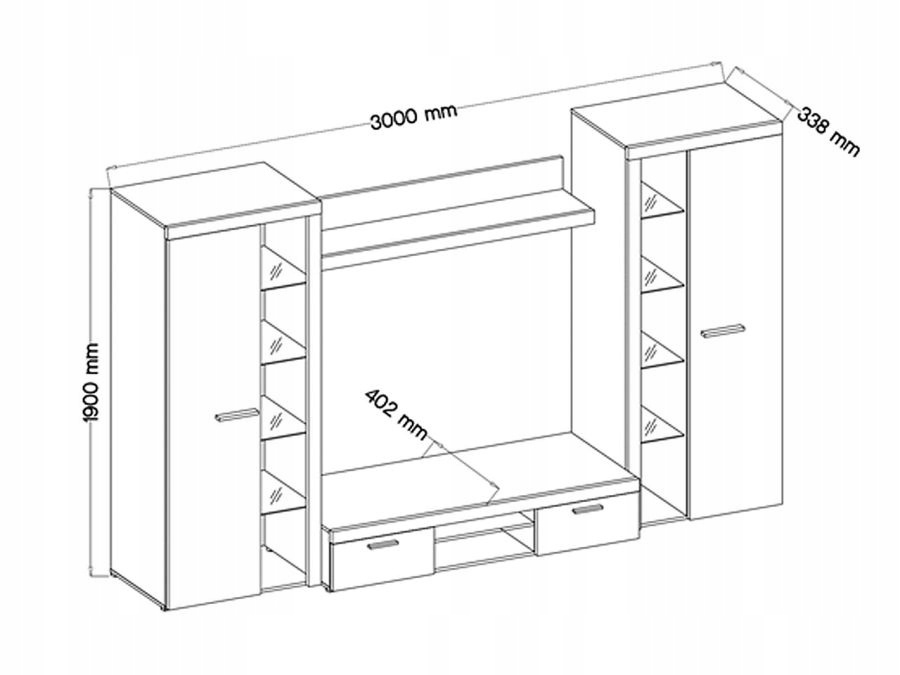 Jest to nowoczesny mebel, który wpasuje się w każde wnętrze. Meblościanka posiada otwarte szklane półki, które można podświetlić oświetleniem LED co jeszcze bardziej podkreśli charakter mebla.