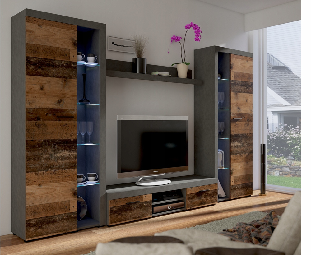 Jest to nowoczesny mebel, który wpasuje się w każde wnętrze. Meblościanka posiada otwarte szklane półki, które można podświetlić oświetleniem LED co jeszcze bardziej podkreśli charakter mebla.