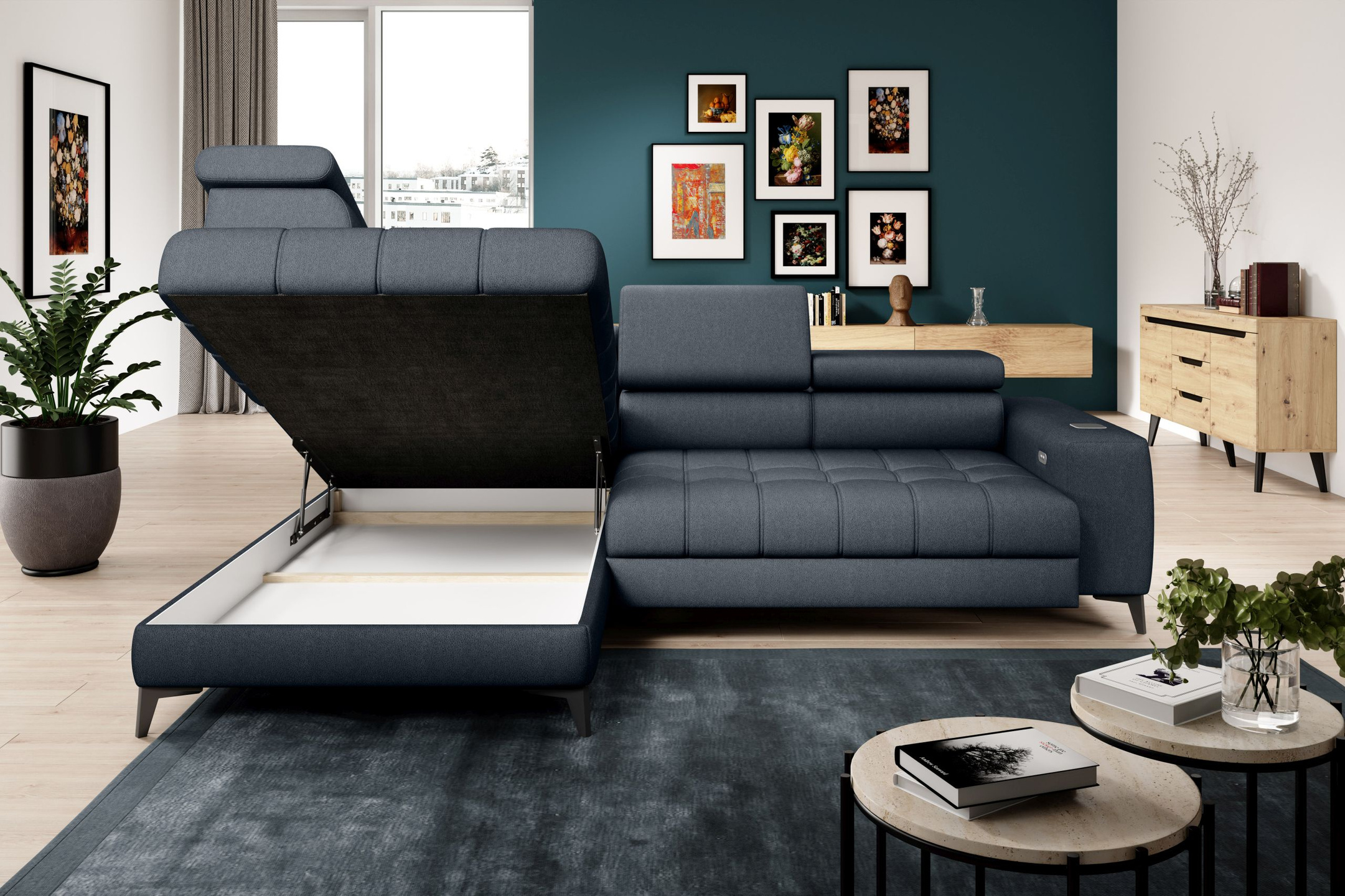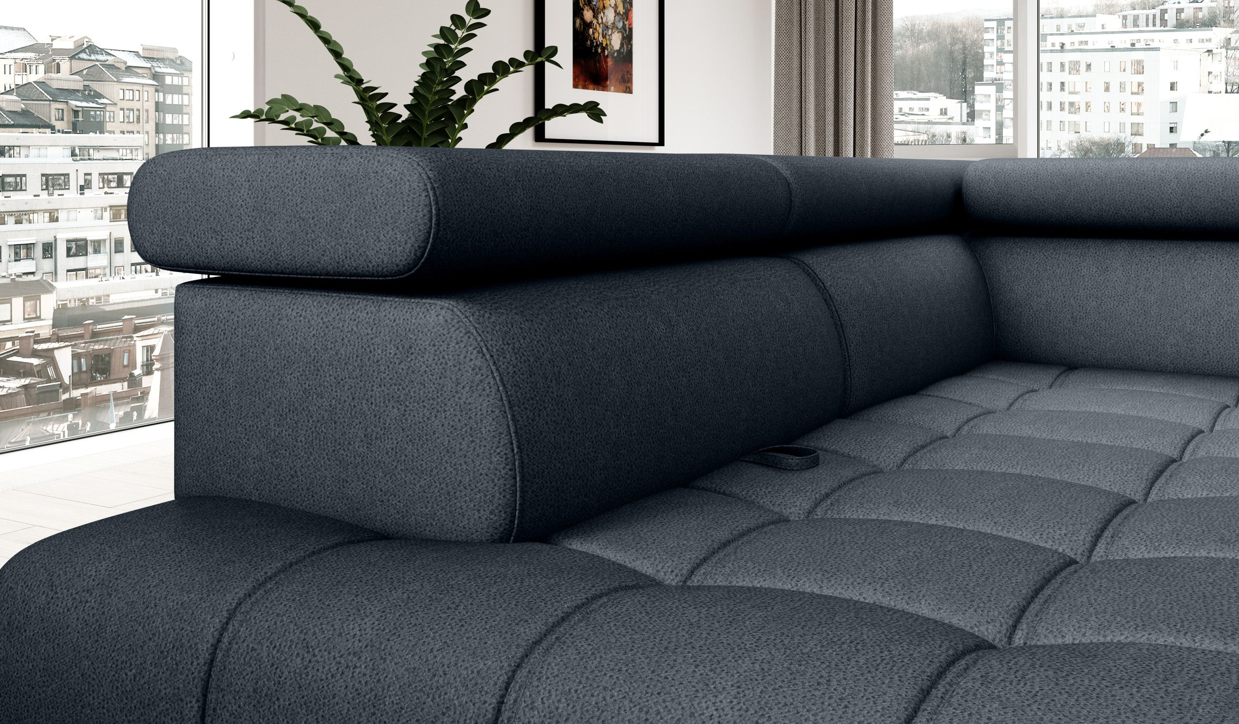 - To narożnik łączący wiele funkcji, zachowując przy tym elegancki i klasyczny efekt wizualny. Możliwość elektrycznej regulacji głębokości siedziska, a także funkcja regulowanego zagłówka zapewniają niesamowity komfort użytkowania.