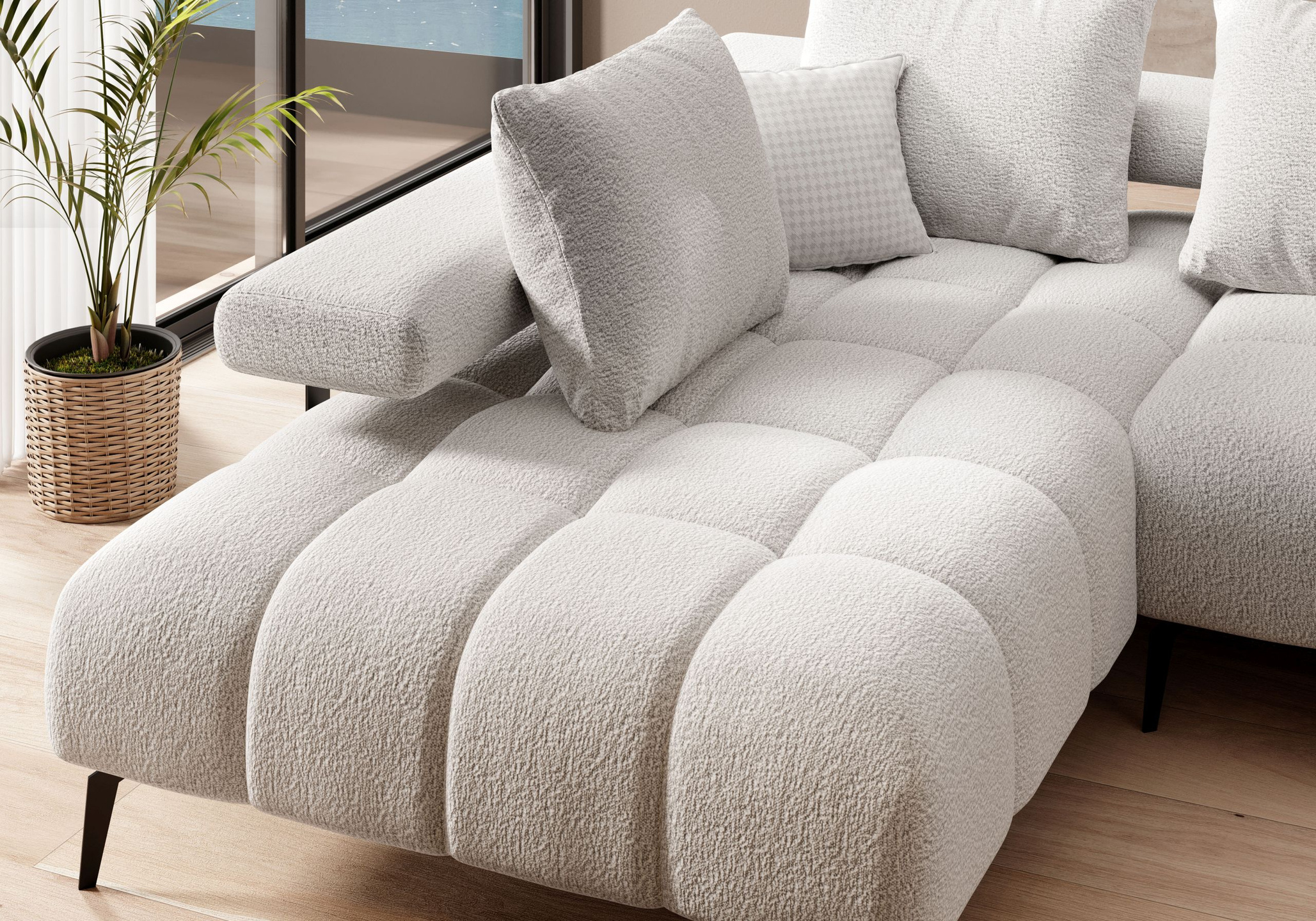 - narożnik nie posiada typowej funkcji spania, ale po wysunięciu siedziska spokojnie wyśpi się jedna osoba (elektrycznie wysuwane siedzisko)