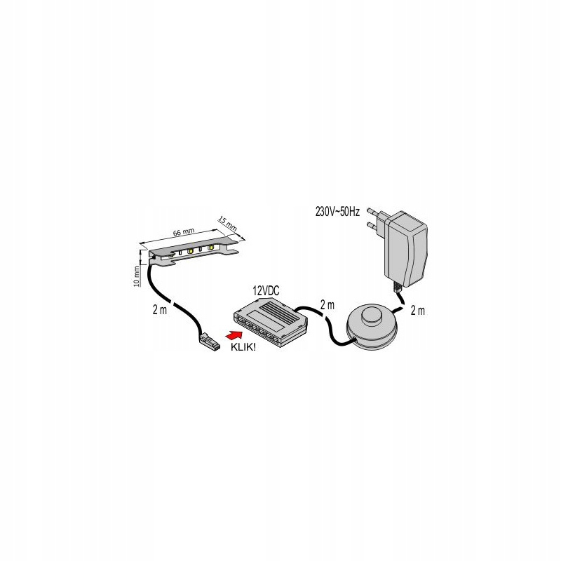 Zestaw składa się z zasilacza z wyłącznikiem nożnym, rozdzielacza DC oraz jednego klipsa.