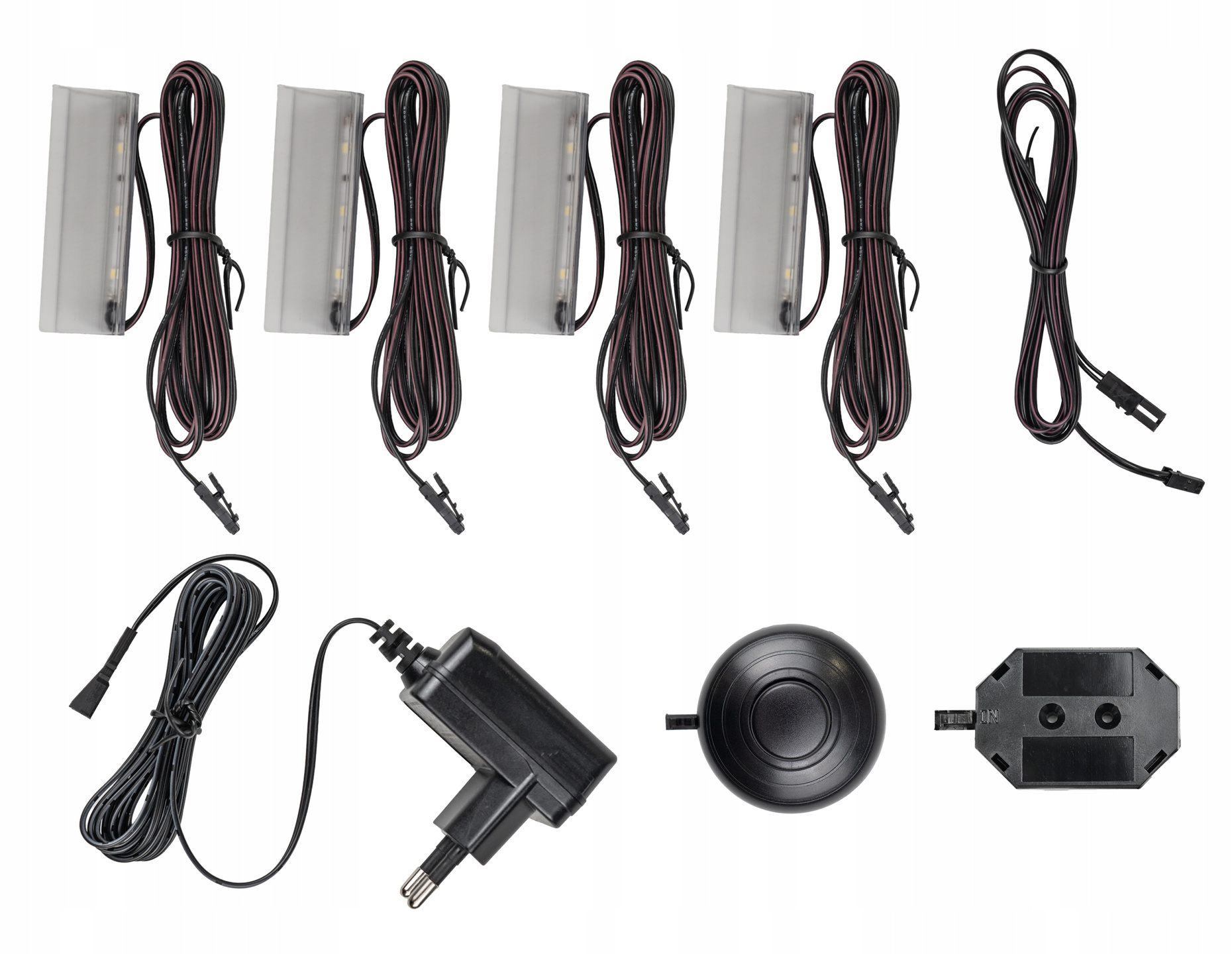 Zestaw składa się z zasilacza z włącznikiem nożnym, rozdzielacza dc oraz czterech klipsów montowanych na półkę.