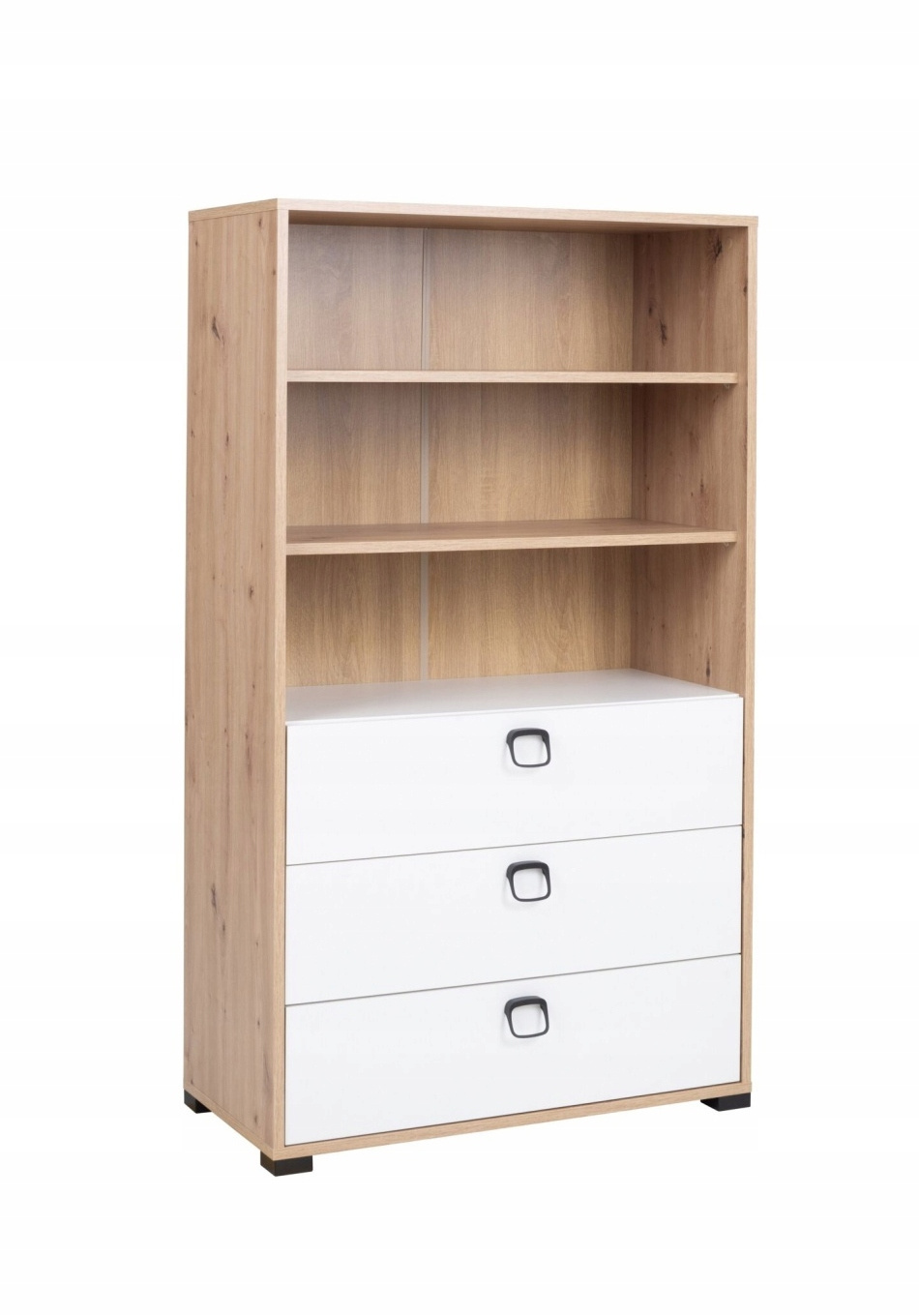 Regał postawiony na nóżkach z tworzywa, posiada trzy szuflady.
