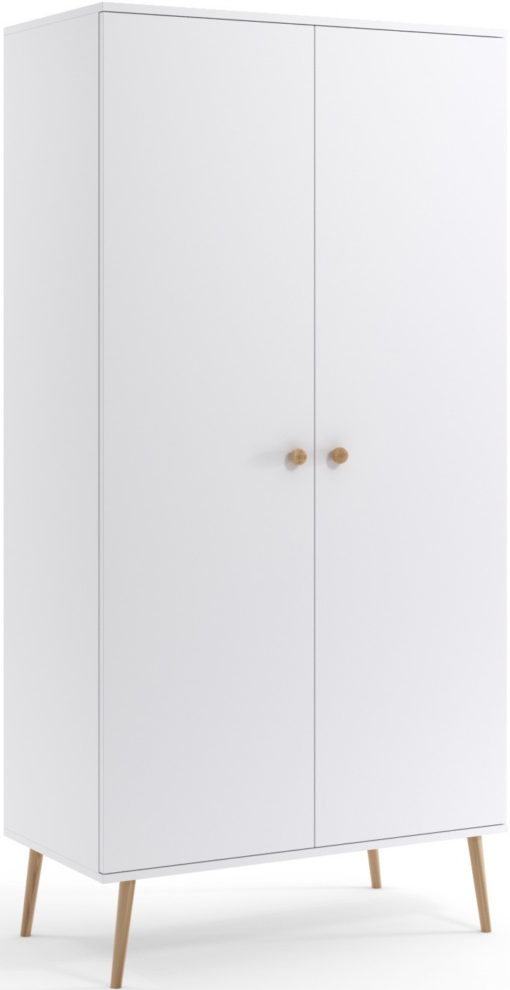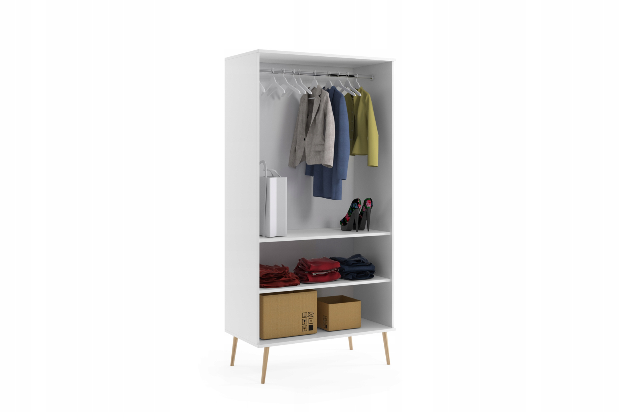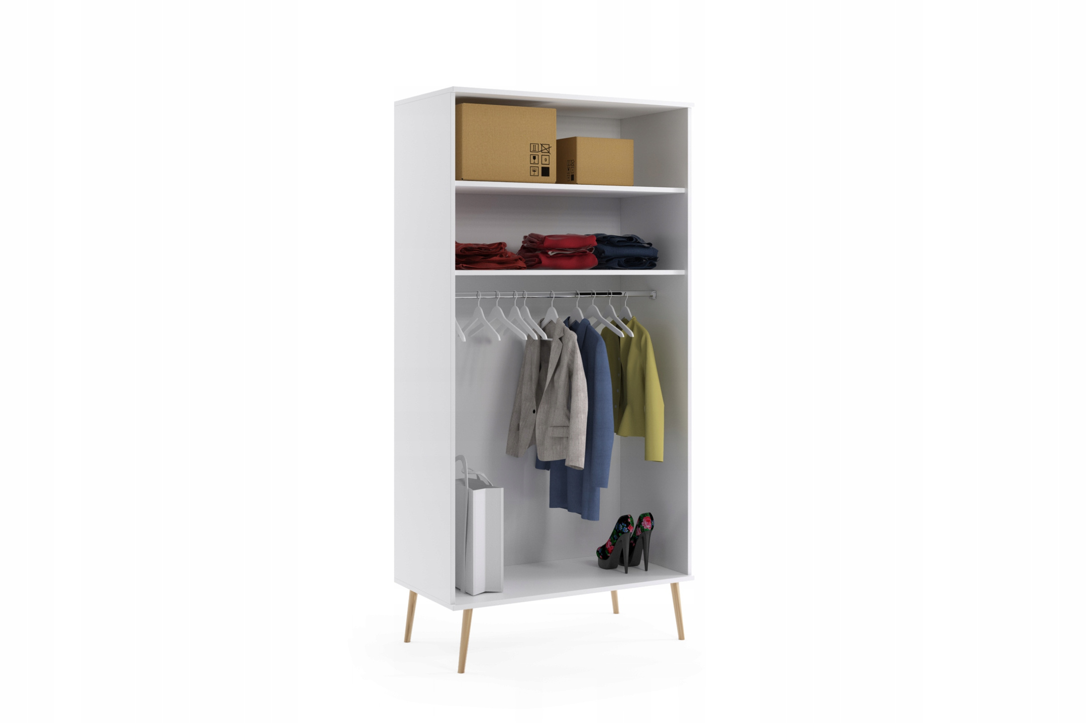 Szafa BOHO uchylna, drewniane nogi BIAŁY MAT dwie półki + drążek