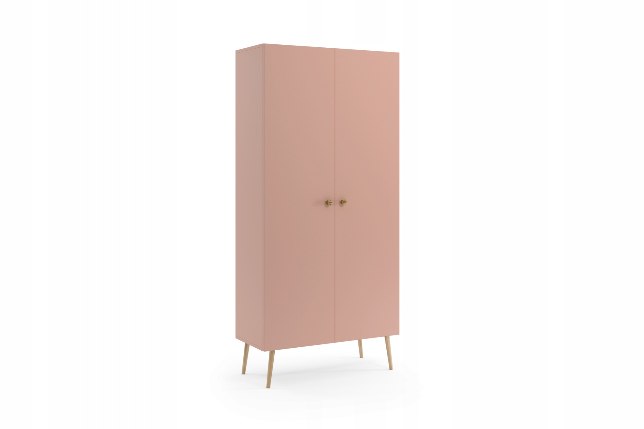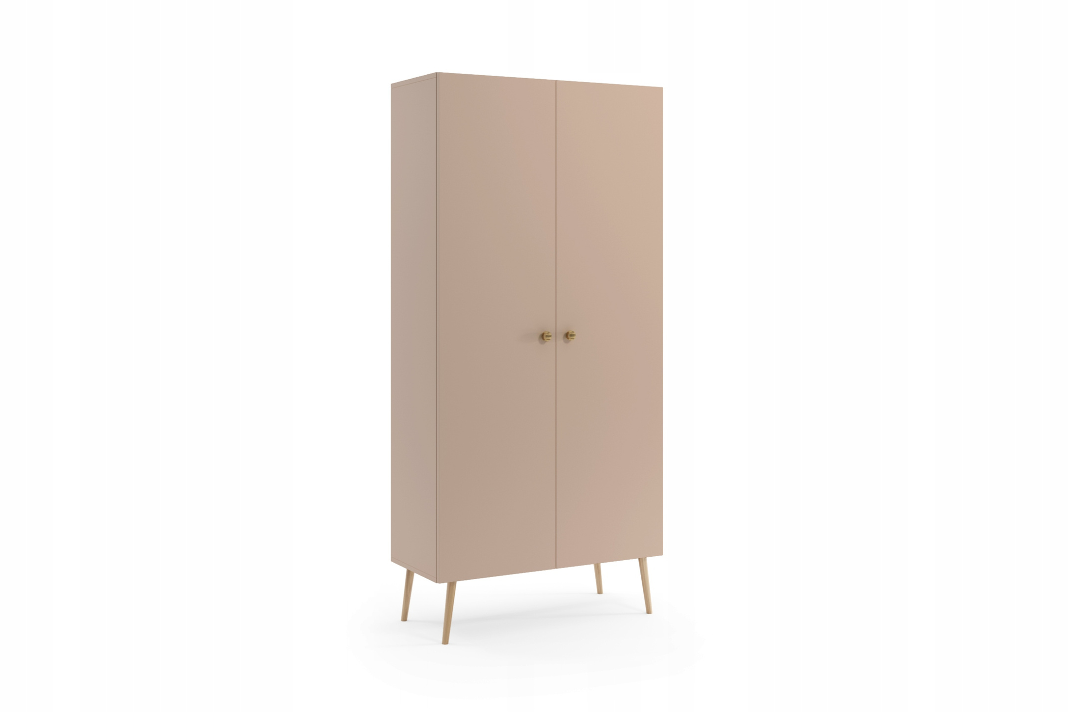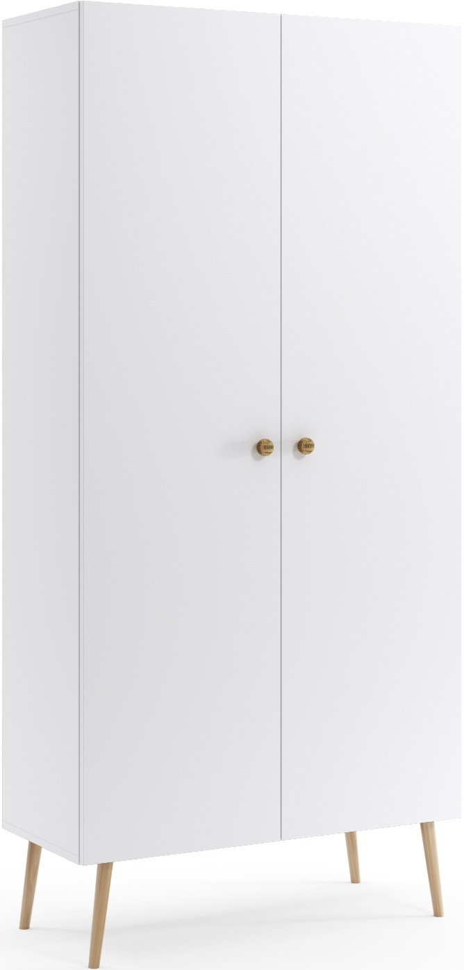 Szafa postawiona na drewnianych nóżkach, posiada dwa uchylne fronty z cichym domykiem. Wewnątrz znajduje się pięć półek z czego trzy posiadają regulację wysokości, dzięki czemu dostosujemy wnętrze według siebie. Jej skandynawski styl sprawia, że szafa doskonale sprawdzi się w sypialni, ale zarówno w przedpokoju czy salonie.