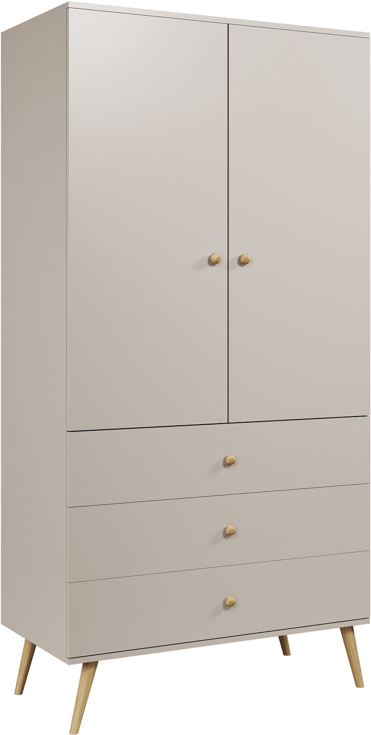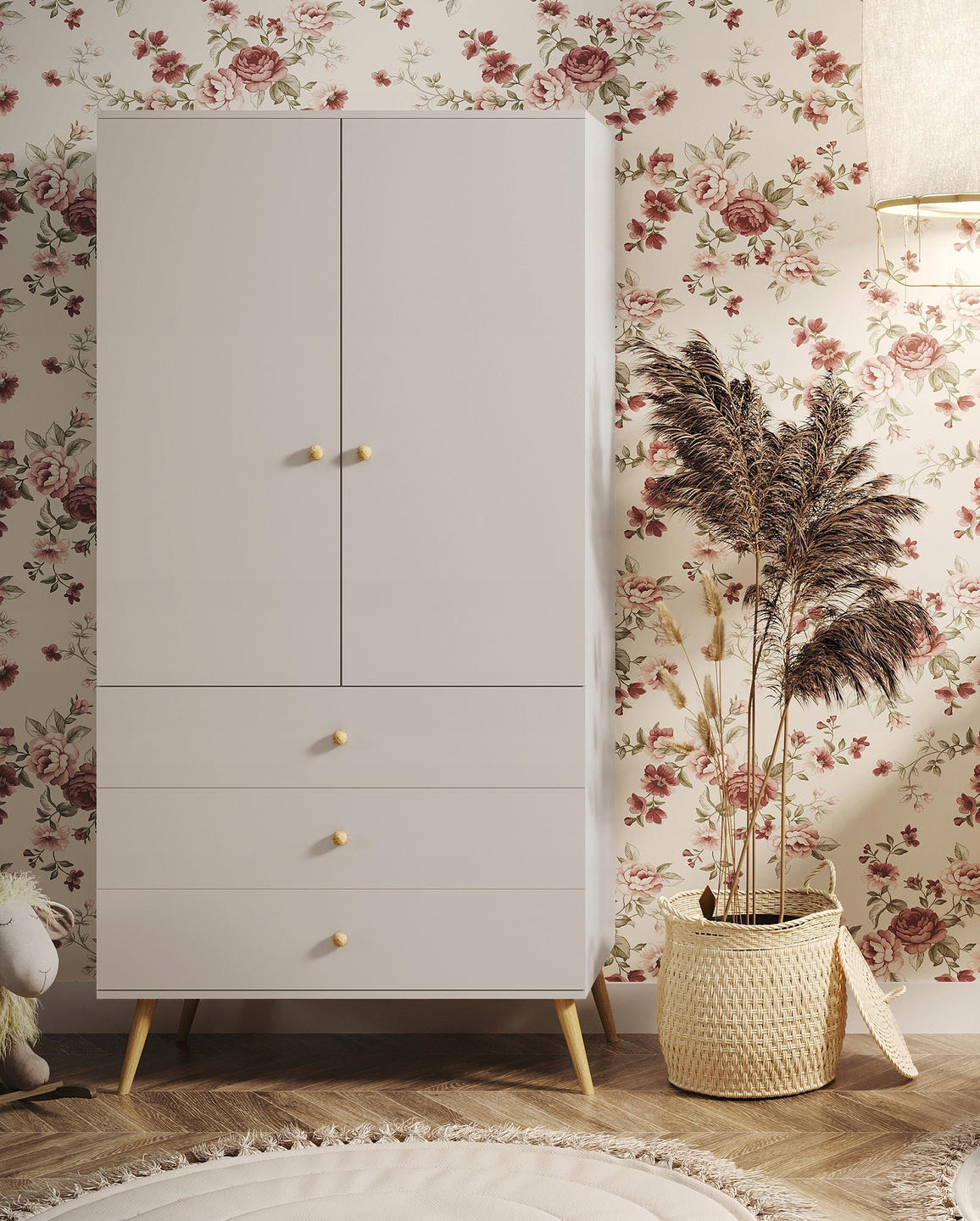 Szafa postawiona na drewnianych nóżkach, posiada dwa uchylne fronty oraz trzy szuflady, wewnątrz znajduje się drążek. Jej skandynawski styl sprawia, że szafa doskonale sprawdzi się w sypialni, ale zarówno w przedpokoju czy salonie.