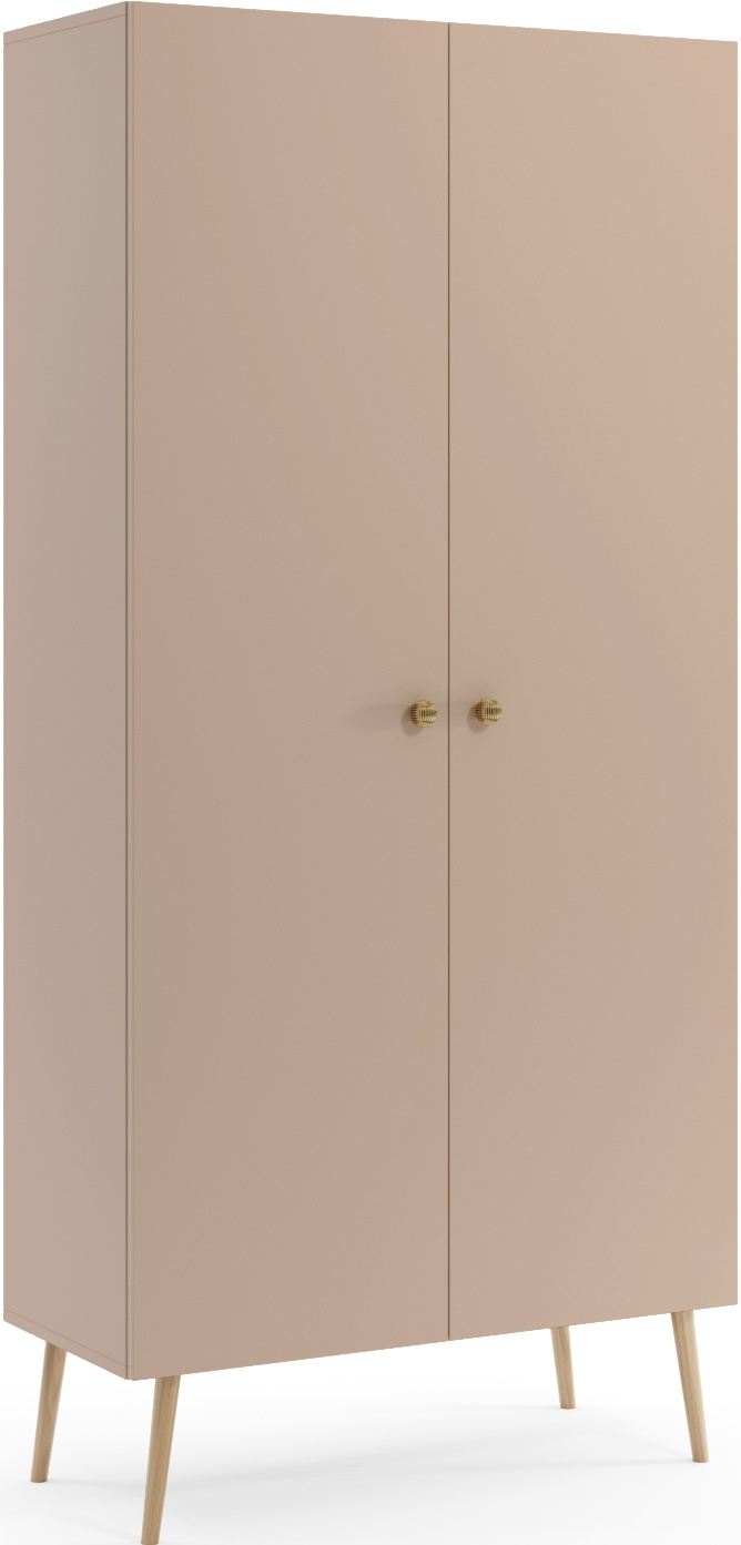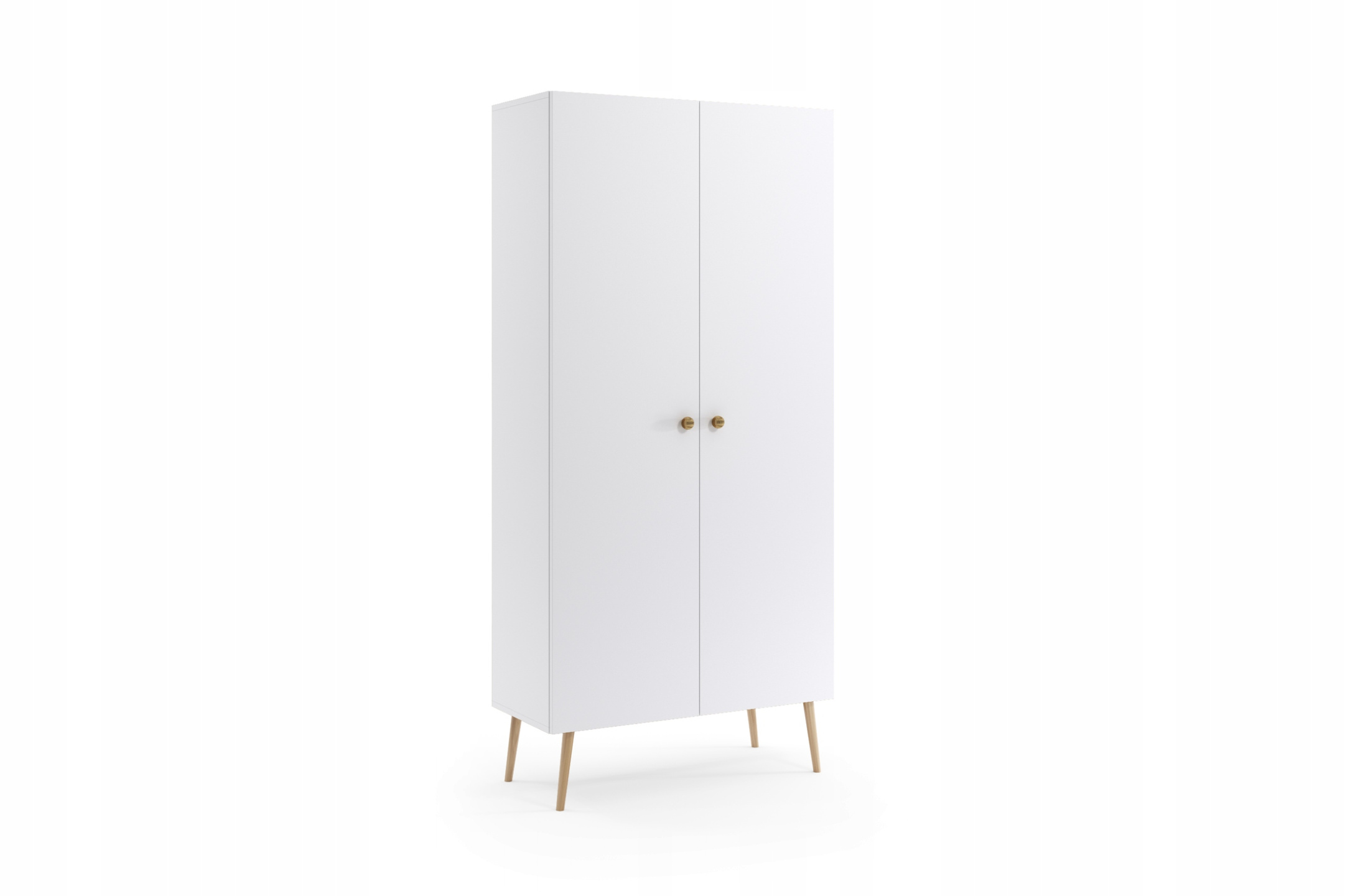 Szafa postawiona na drewnianych nóżkach, posiada dwa uchylne fronty z cichym domykiem. Wewnątrz znajduje się pięć półek z czego trzy posiadają regulację wysokości, dzięki czemu dostosujemy wnętrze według siebie. Jej skandynawski styl sprawia, że szafa doskonale sprawdzi się w sypialni, ale zarówno w przedpokoju czy salonie.