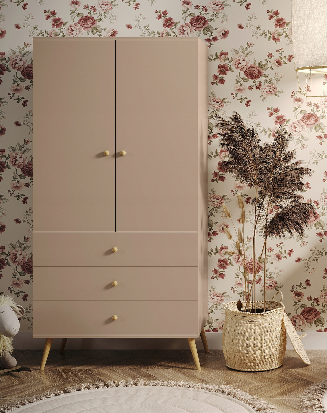 Szafa BOHO uchylna, drewniane nogi MACCHIATO trzy szuflady + drążek