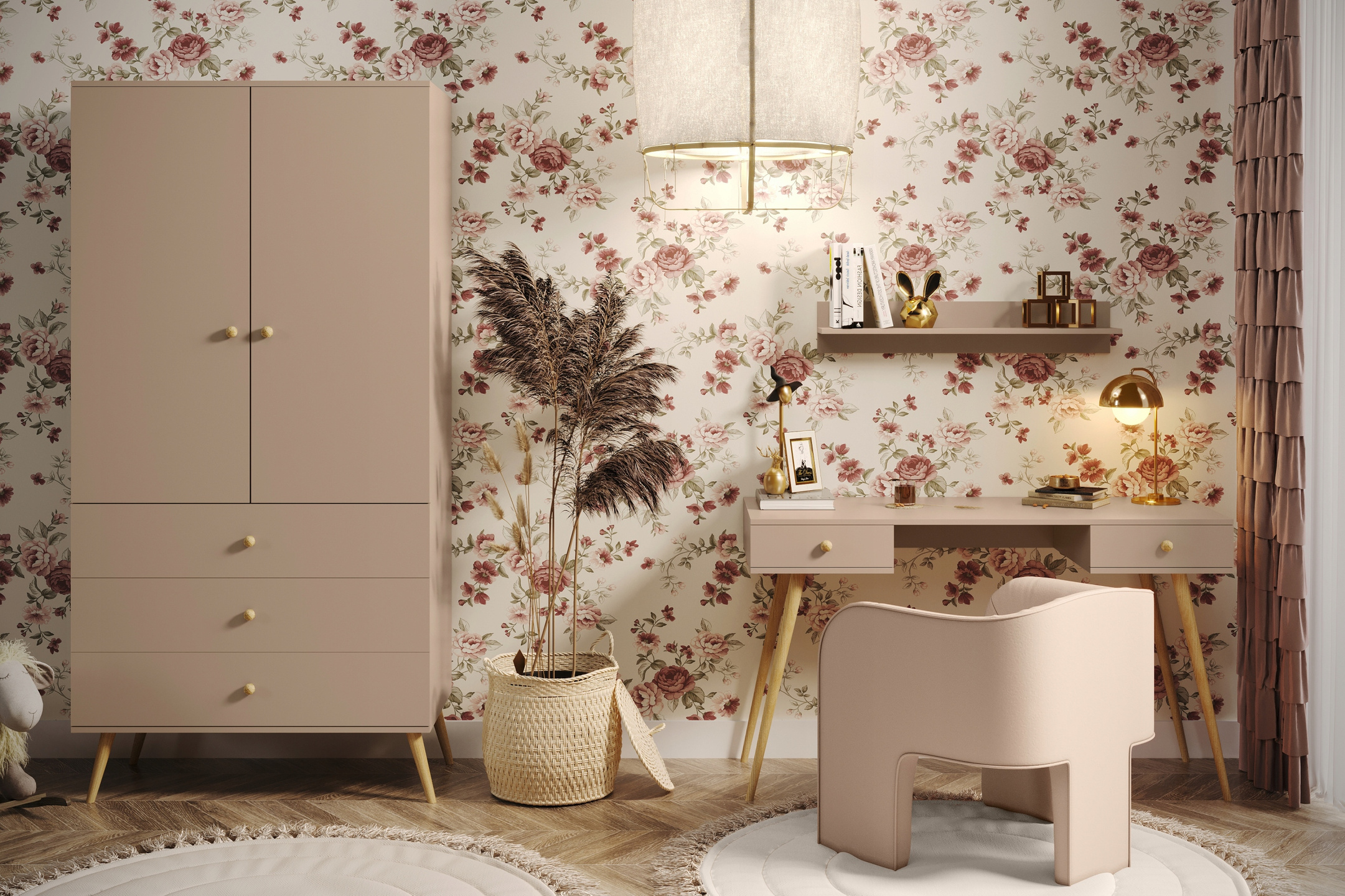 Szafa BOHO uchylna, drewniane nogi MACCHIATO trzy szuflady + drążek Kolor frontów odcienie beżu