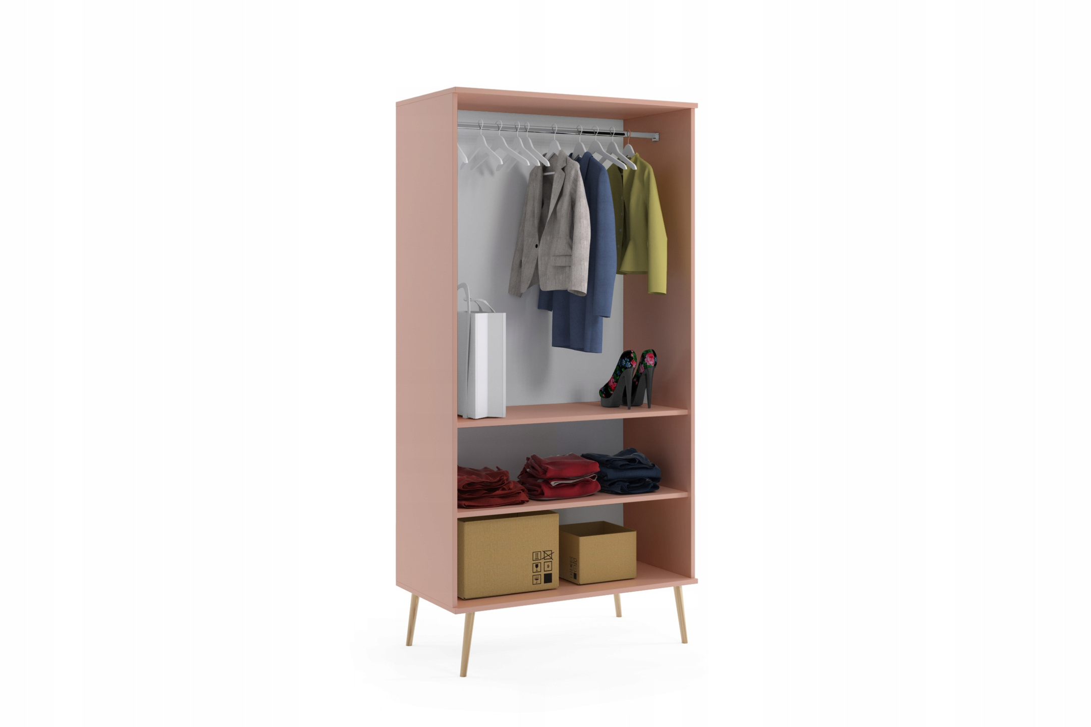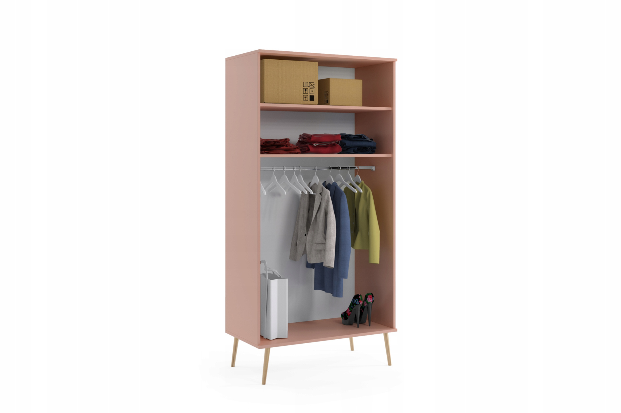 Szafa BOHO uchylna, drewniane nogi RÓŻ dwie półki + drążek