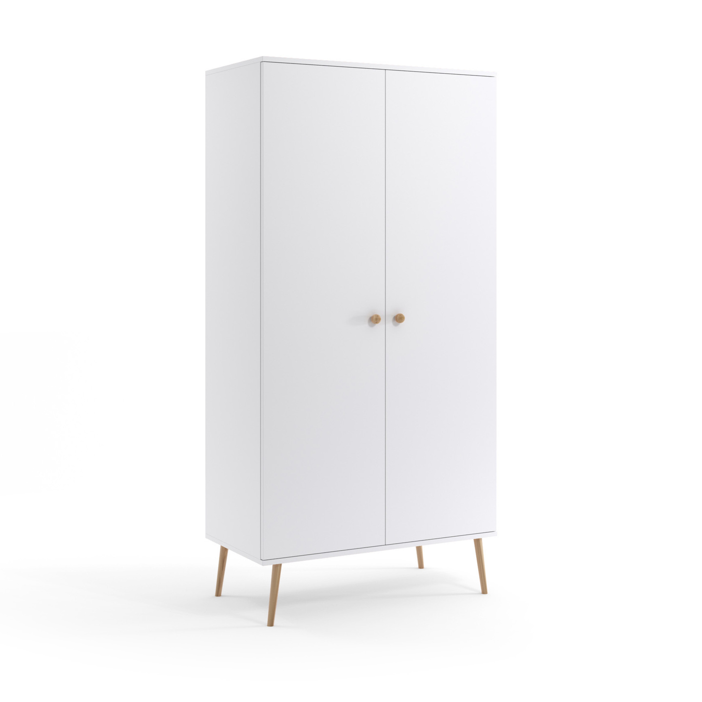 Szafa postawiona na drewnianych nóżkach, posiada dwa uchylne fronty z cichym domykiem. Wewnątrz znajduje się drążek oraz dwie półki. Jej skandynawski styl sprawia, że szafa doskonale sprawdzi się w sypialni, ale zarówno w przedpokoju czy salonie.